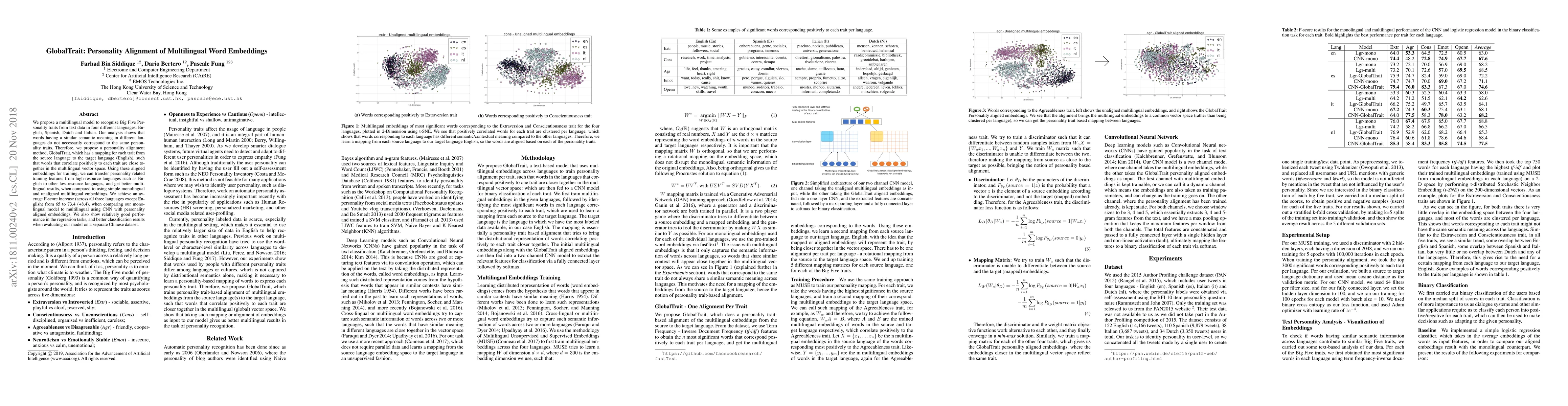The paper introduces GlobalTrait, a multilingual model that aligns personality traits across four languages to improve personality recognition. It demonstrates that personality traits do not map directly across languages, leading to the development of an alignment method that enhances transfer learning from high-resource to low-resource languages, resulting in an 8.4% increase in F-score.