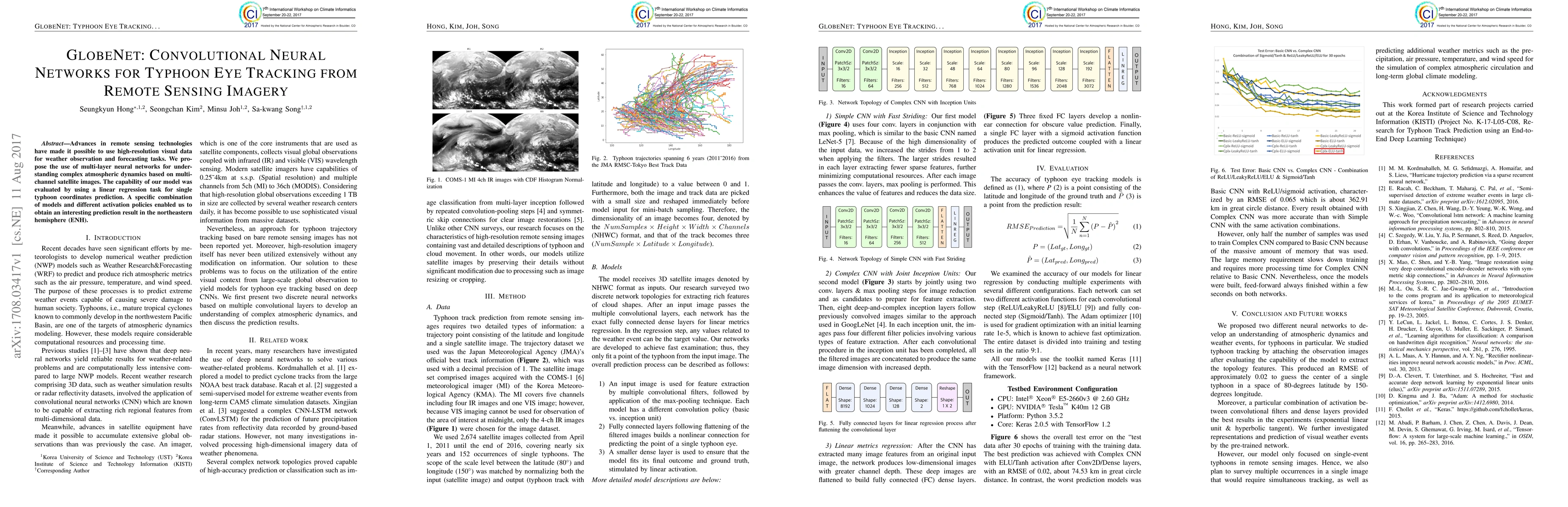 Advances in remote sensing technologies have made it possible to use high-resolution visual data for weather observation and forecasting tasks. We propose the use of multi-layer neural networks for understanding complex atmospheric dynamics based on multichannel satellite images. The capability of our model was evaluated by using a linear regression task for single typhoon coordinates prediction. A specific combination of models and different activation policies enabled us to obtain an interesting prediction result in the northeastern hemisphere (ENH).