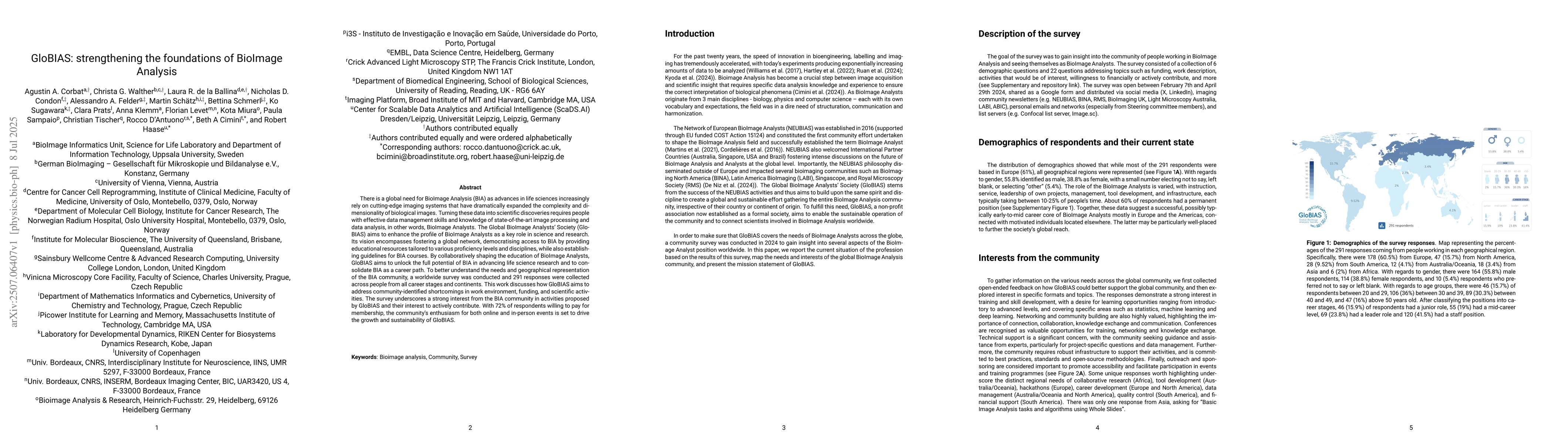 There is a global need for BioImage Analysis (BIA) as advances in life sciences increasingly rely on cutting-edge imaging systems that have dramatically expanded the complexity and dimensionality of biological images. Turning these data into scientific discoveries requires people with effective data management skills and knowledge of state-of-the-art image processing and data analysis, in other words, BioImage Analysts. The Global BioImage Analysts' Society (GloBIAS) aims to enhance the profile of BioImage Analysts as a key role in science and research. Its vision encompasses fostering a global network, democratising access to BIA by providing educational resources tailored to various proficiency levels and disciplines, while also establishing guidelines for BIA courses. By collaboratively shaping the education of BioImage Analysts, GloBIAS aims to unlock the full potential of BIA in advancing life science research and to consolidate BIA as a career path. To better understand the needs and geographical representation of the BIA community, a worldwide survey was conducted and 291 responses were collected across people from all career stages and continents. This work discusses how GloBIAS aims to address community-identified shortcomings in work environment, funding, and scientific activities. The survey underscores a strong interest from the BIA community in activities proposed by GloBIAS and their interest to actively contribute. With 72% of respondents willing to pay for membership, the community's enthusiasm for both online and in-person events is set to drive the growth and sustainability of GloBIAS.