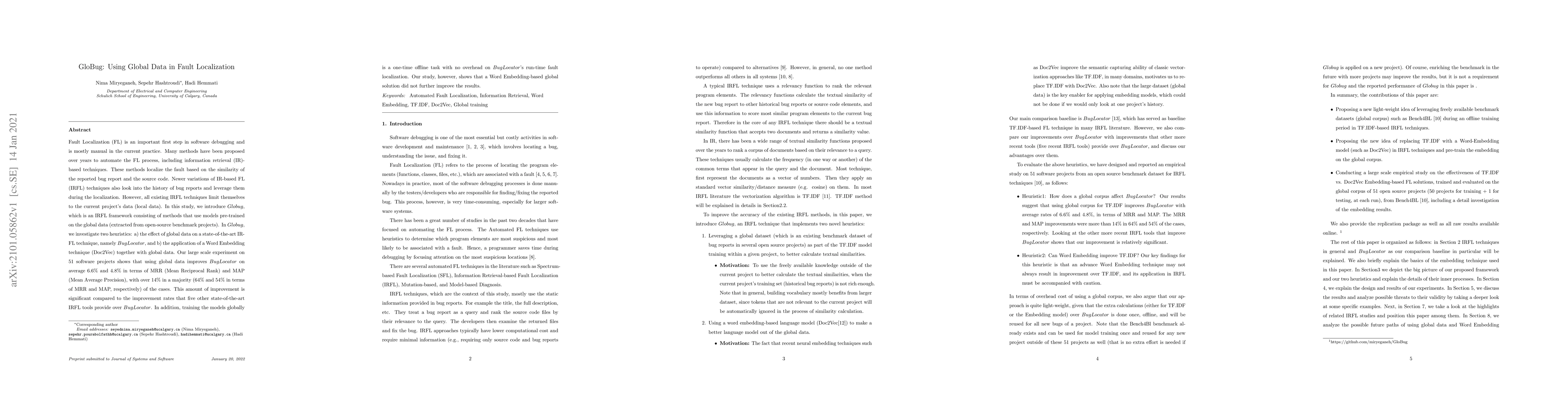 GloBug introduces an IRFL framework using global data from open-source projects to improve fault localization, showing a 6.6% and 4.8% average improvement in MRR and MAP respectively over BugLocator. However, combining Word Embedding techniques with global data did not yield further enhancements.