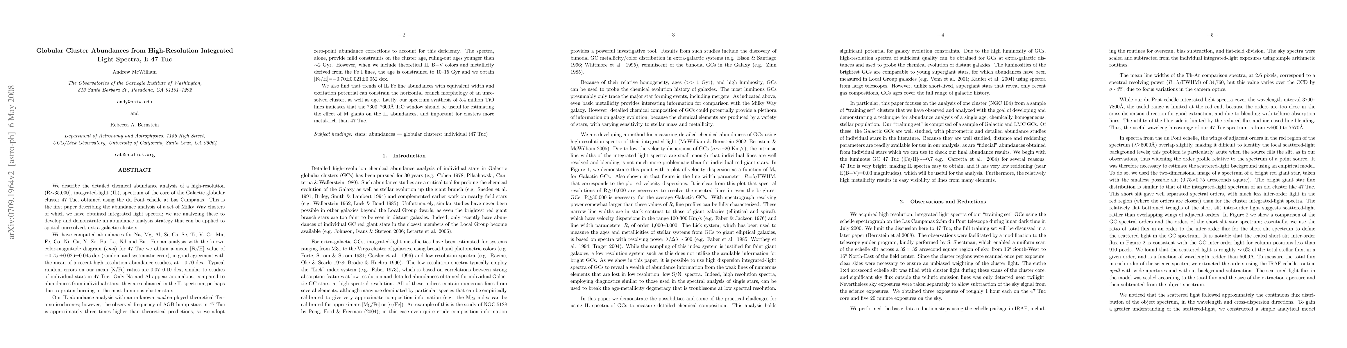We describe the detailed chemical abundance analysis of a high-resolution (R~35,000), integrated-light (IL), spectrum of the core of the Galactic globular cluster 47 Tuc, obtained using the du Pont echelle at Las Campanas. We develop an abundance analysis strategy that can be applied to spatial unresolved extra- galactic clusters. We have computed abundances for Na, Mg, Al, Si, Ca, Sc, Ti, V, Cr, Mn, Fe, Co, Ni, Cu, Y, Zr, Ba, La, Nd and Eu. For an analysis with the known color-magnitude diagram (cmd) for 47 Tuc we obtain a mean [Fe/H] value of -0.75 +/-0.026+/-0.045 dex (random and systematic error), in good agreement with the mean of 5 recent high resolution abundance studies, at -0.70 dex. Typical random errors on our mean [X/Fe] ratios are 0.07-0.10 dex, similar to studies of individual stars in 47 Tuc, although Na and Al appear enhanced, perhaps due to proton burning in the most luminous cluster stars. Our IL abundance analysis with an unknown cmd employed theoretical Teramo isochrones; however, we apply zero-point abundance corrections to account for the factor of 3 underprediction of stars at the AGB bump luminosity. While line diagnostics alone provide only mild constraints on the cluster age (ruling-out ages younger than ~2 Gyr), when theoretical IL B-V colors are combined with metallicity derived from the Fe I lines, the age is constrained to 10--15 Gyr and we obtain [Fe/H]=-0.70 +/-0.021 +/-0.052 dex. We find that Fe I line diagnostics may also be used to constrain the horizontal branch morphology of an unresolved cluster. Lastly, our spectrum synthesis of 5.4 million TiO lines indicates that the 7300-7600A TiO window should be useful for estimating the effect of M giants on the IL abundances, and important for clusters more metal-rich than 47 Tuc.