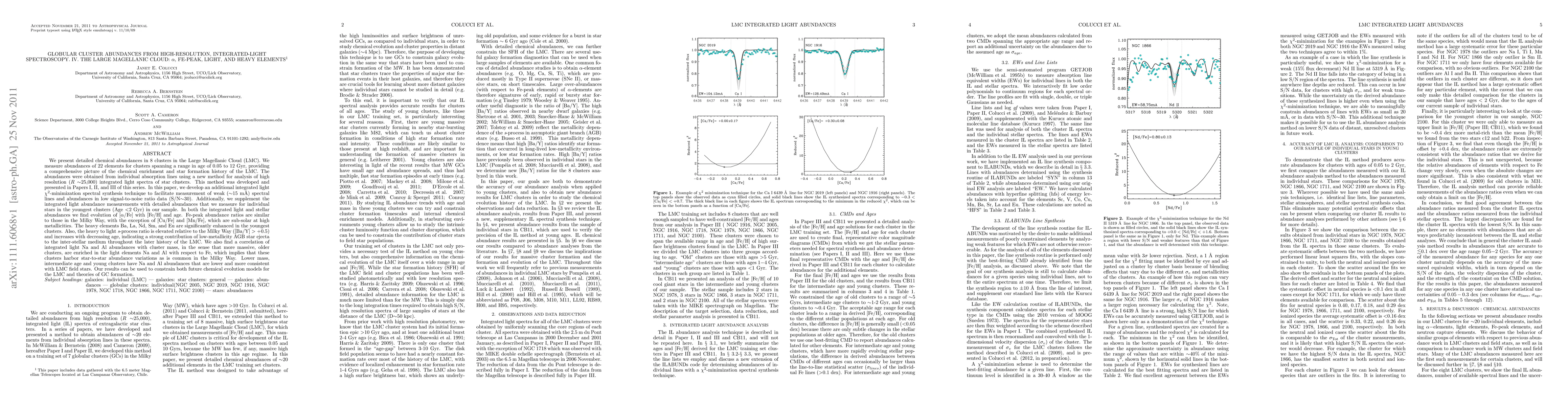 We present detailed chemical abundances in 8 clusters in the Large Magellanic Cloud (LMC). We measure abundances of 22 elements for clusters spanning a range in age of 0.05 to 12 Gyr, providing a comprehensive picture of the chemical enrichment and star formation history of the LMC. The abundances were obtained from individual absorption lines using a new method for analysis of high resolution ($R\sim$25,000) integrated light spectra of star clusters. This method was developed and presented in Papers I, II, and III of this series. In this paper, we develop an additional integrated light $\chi^2$-minimization spectral synthesis technique to facilitate measurement of weak ($\sim$15 m\AA) spectral lines and abundances in low signal-to-noise ratio data (S/N$\sim$30). Additionally, we supplement the integrated light abundance measurements with detailed abundances that we measure for individual stars in the youngest clusters (Age$<$2 Gyr) in our sample. In both the integrated light and stellar abundances we find evolution of [$\alpha$/Fe] with [Fe/H] and age. Fe-peak abundance ratios are similar to those in the Milky Way, with the exception of [Cu/Fe] and [Mn/Fe], which are sub-solar at high metallicities. The heavy elements Ba, La, Nd, Sm, and Eu are significantly enhanced in the youngest clusters. Also, the heavy to light s-process ratio is elevated relative to the Milky Way ([Ba/Y]$>+0.5$) and increases with decreasing age, indicating a strong contribution of low-metallicity AGB star ejecta to the interstellar medium throughout the later history of the LMC. We also find a correlation of integrated light Na and Al abundances with cluster mass, in the sense that more massive, older clusters are enriched in the light elements Na and Al with respect to Fe, which implies that these clusters harbor star-to-star abundance variations as is common in the Milky Way.