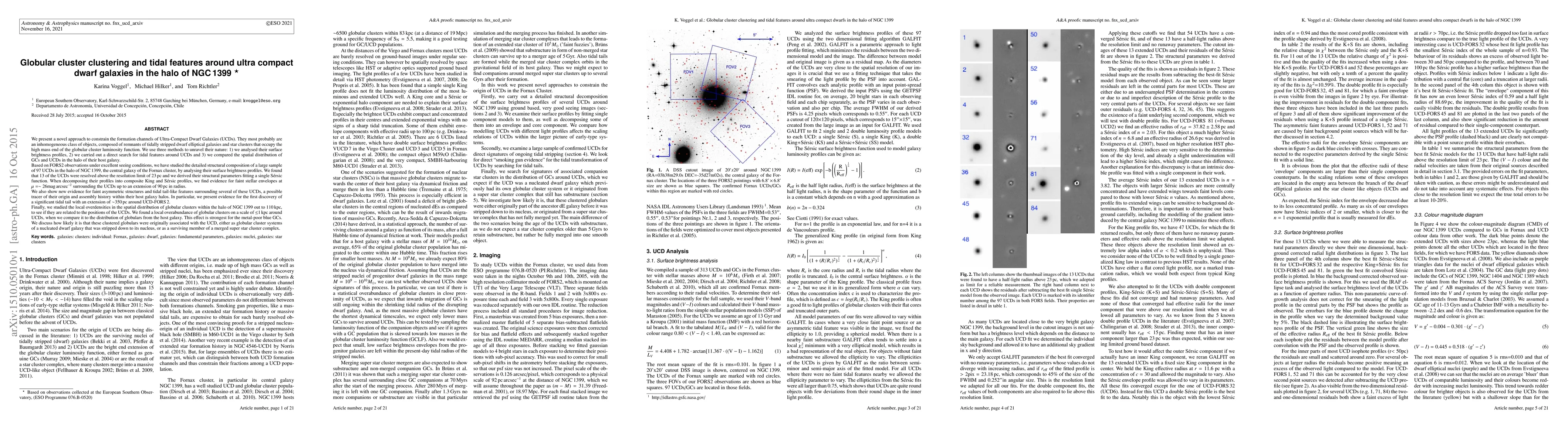We present a novel approach to constrain the formation channels of Ultra-Compact Dwarf Galaxies (UCDs). This inhomogeneous class of objects of remnants of tidally stripped dwarf elliptical galaxies and high mass globular clusters. We use three methods to unravel their nature: 1) we analysed their surface brightness profiles, 2) we carried out a direct search for tidal features around UCDs and 3) we compared the spatial distribution of GCs and UCDs in the halo of their host galaxy. Based on FORS2 observations, we have studied the detailed structural composition of a large sample of 97 UCDs in the halo of NGC1399, the central galaxy of the Fornax cluster, by analysing theirsurface brightness profiles. We derived the structural parameters of 13 extended UCDs modelling them with a single Sersic function and decomposing them into composite King and Sersic profiles. We find evidence for faint stellar envelopes at mu=~26 mag\arcsec^-2 surrounding the UCDs up to an extension of 90pc in radius. We also show new evidence for faint asymmetric structures and tidal tail-like features surrounding several of these UCDs, a possible tracer of their origin and assembly history within their host galaxy halos. In particular, we present evidence for the first discovery of a significant tidal tail with an extension of ~350pc around UCD-FORS2. We searched for local overdensities in the spatial distribution of globular clusters within the halo of NGC1399, to see if they are related to the positions of the UCDs. We found a local overabundance of globular clusters on a scale of <1kpc around UCDs, when we compare it to the distribution of globulars from the host galaxy. This effect is strongest for the metal-poor blue GCs. We discuss how likely it is that these clustered globulars were originally associated with the UCD.