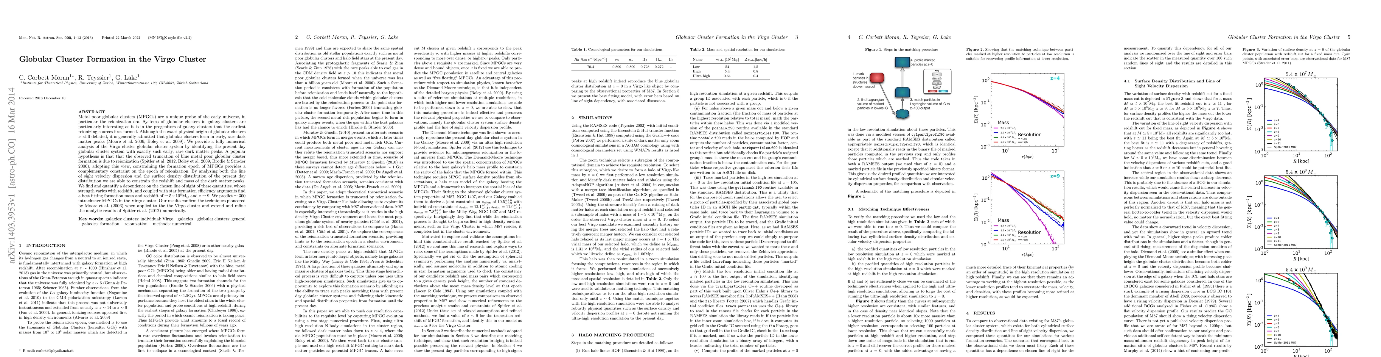 This paper conducts a numerical analysis of globular cluster formation in the Virgo cluster, identifying these clusters with early dark matter peaks. It finds a best-fitting formation mass and redshift of $5 \times 10^8 \rm{M}_\odot$ and $z\simeq 9$, supporting the hypothesis that reionization truncated blue metal poor globular cluster formation.