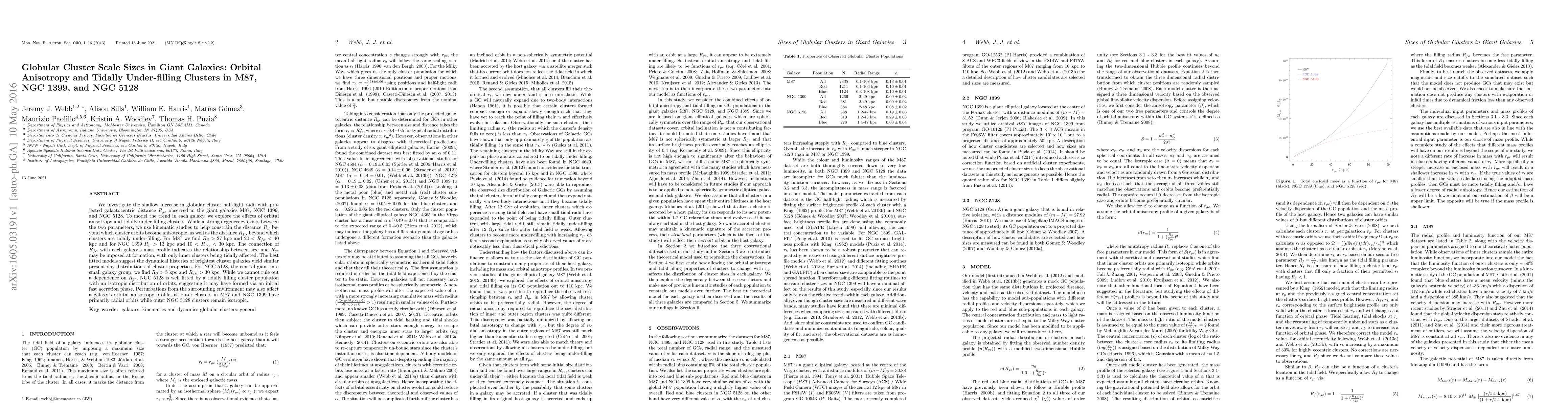 This paper examines the relationship between globular cluster half-light radii and their projected galactocentric distances in three giant galaxies, attributing the observed trend to orbital anisotropy and tidally under-filling clusters. The study finds that while inner clusters are tidally affected, outer clusters exhibit anisotropic orbits, suggesting different formation histories for each galaxy.
