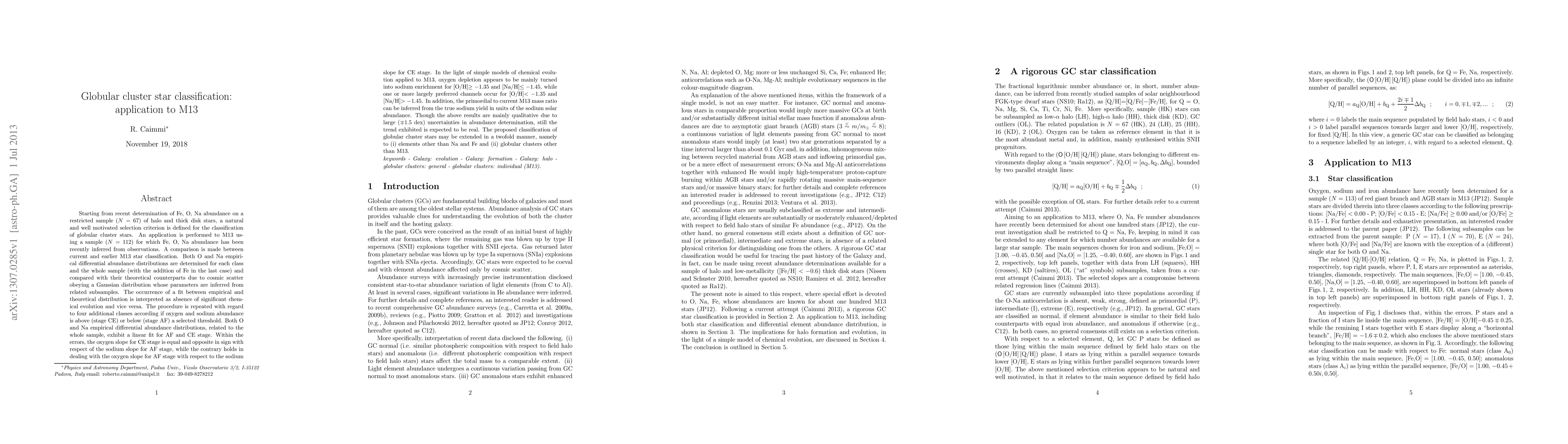 This paper proposes a classification method for globular cluster stars based on Fe, O, and Na abundances, applied to M13. The study compares new classifications with previous ones, revealing O-Na anticorrelations and discussing chemical evolution models.