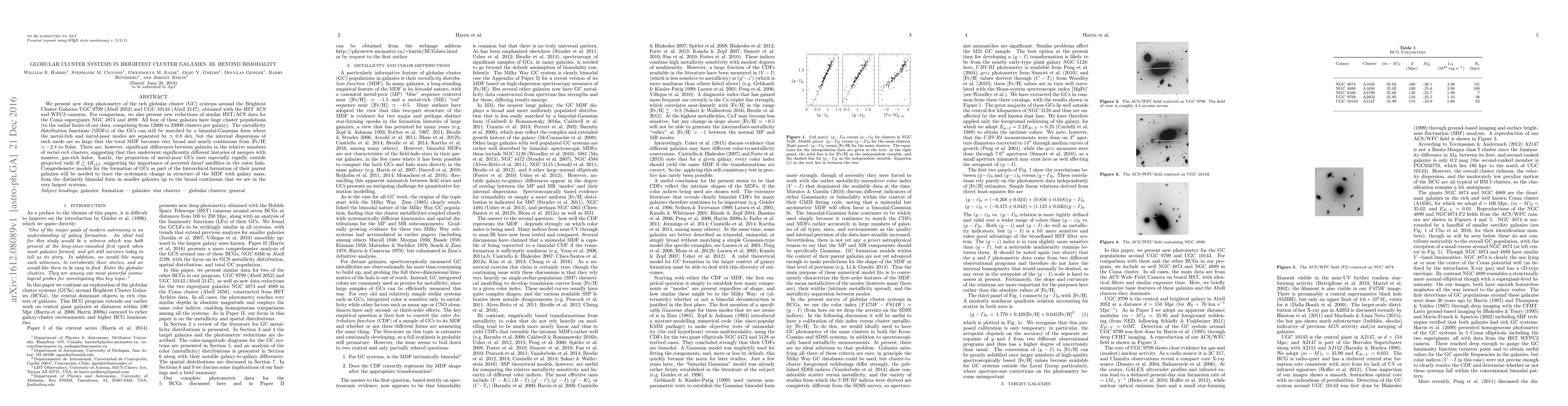 This study analyzed the globular cluster systems of four bright cluster galaxies, finding that their metallicity distributions shift from bimodal to broad continua as galaxy mass increases, suggesting complex histories of mergers and accretion.
