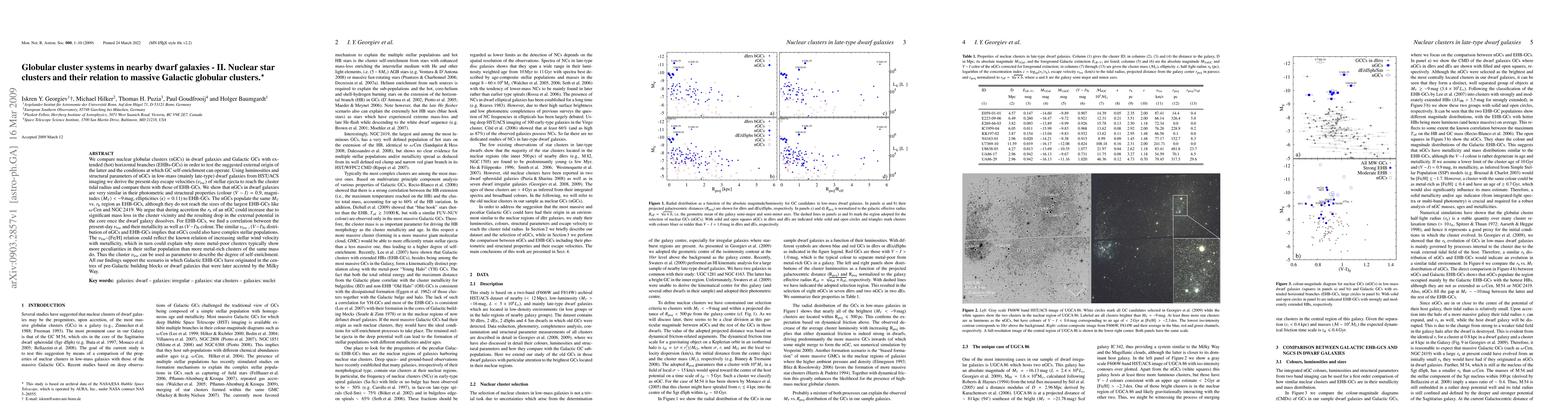 This paper investigates nuclear globular clusters (nGCs) in nearby dwarf galaxies using HST/ACS imaging, finding that their escape velocities correlate with metallicity and color similar to Galactic globular clusters with extended horizontal branches (EHB-GCs). The study suggests that nGCs may also have complex stellar populations, supporting the theory that Galactic EHB-GCs originated from the centers of pre-Galactic dwarf galaxies.