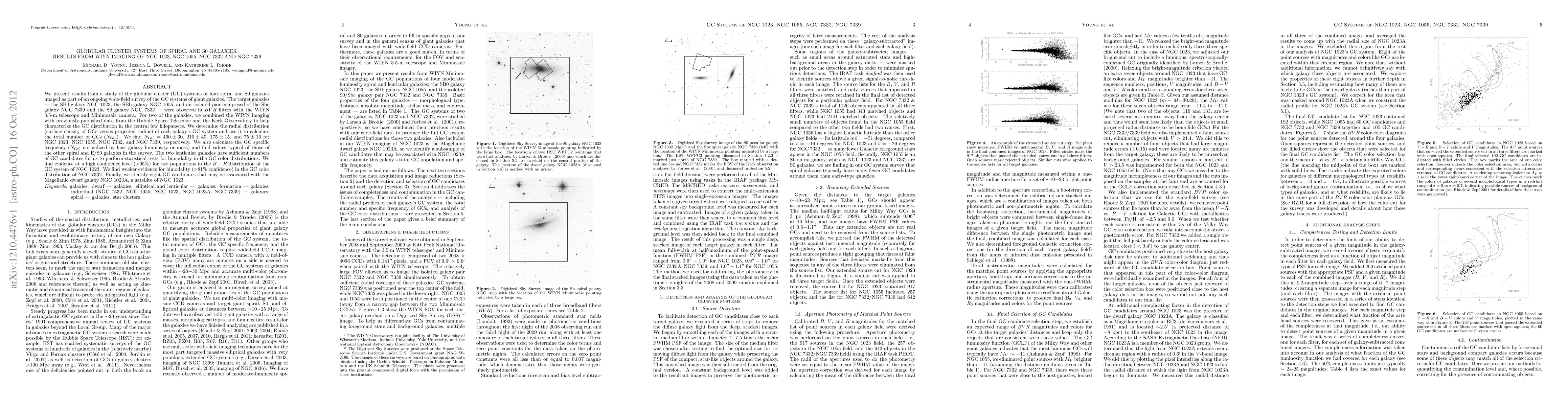 The study used WIYN 3.5-m telescope imaging to analyze globular cluster (GC) systems in four spiral and lenticular galaxies. Findings include determining GC counts (N_GC) for each galaxy, calculating specific frequencies, identifying bimodal color distributions in two lenticular galaxies with high confidence, and pinpointing potential GC candidates associated with a satellite galaxy, NGC1023A.
