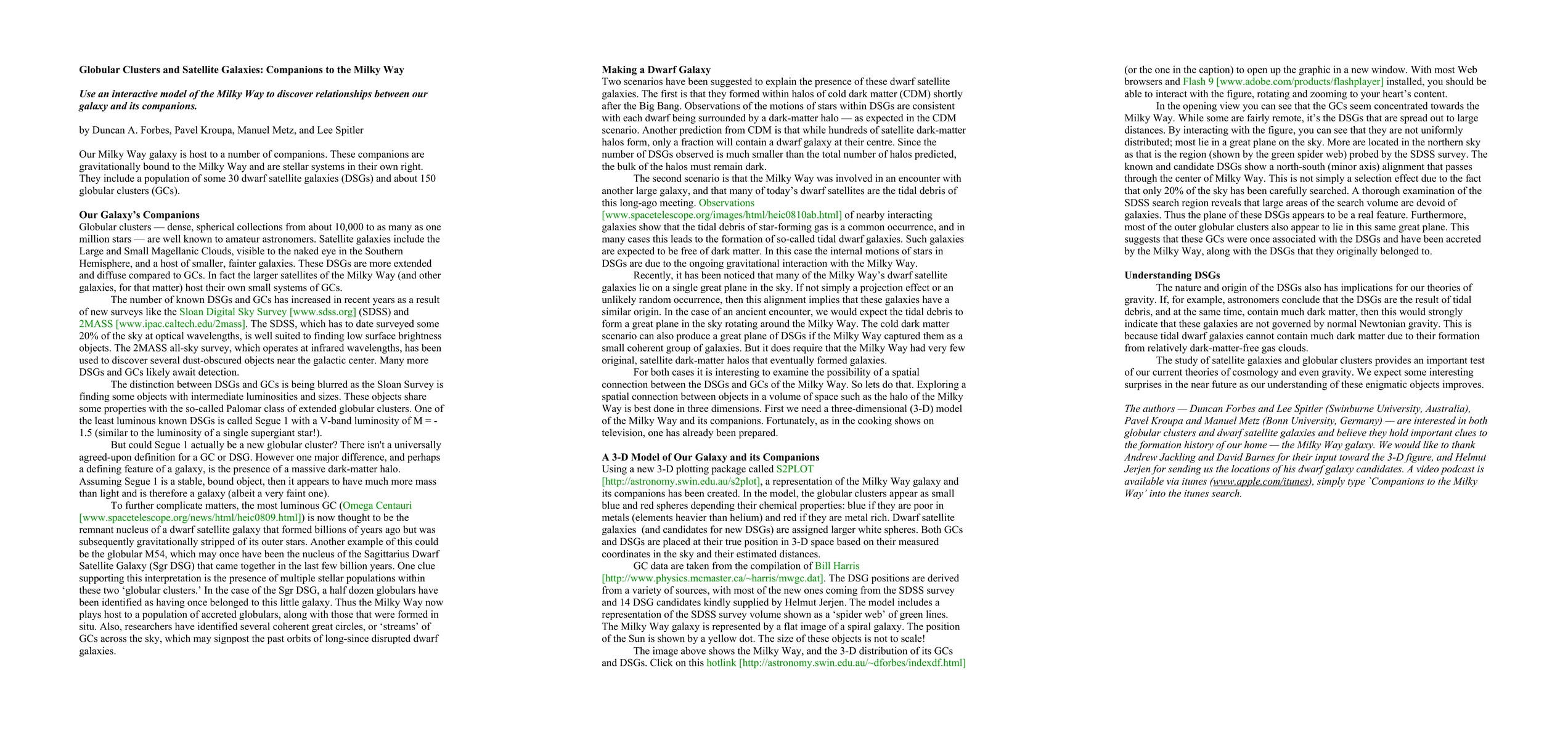 Our Milky Way galaxy is host to a number of companions. These companions are gravitationally bound to the Milky Way and are stellar systems in their own right. They include a population of some 30 dwarf satellite galaxies (DSGs) and about 150 globular clusters (GCs). Here we discuss the relationship between GCs and DSGs using an interactive 3D model of the Milky Way.