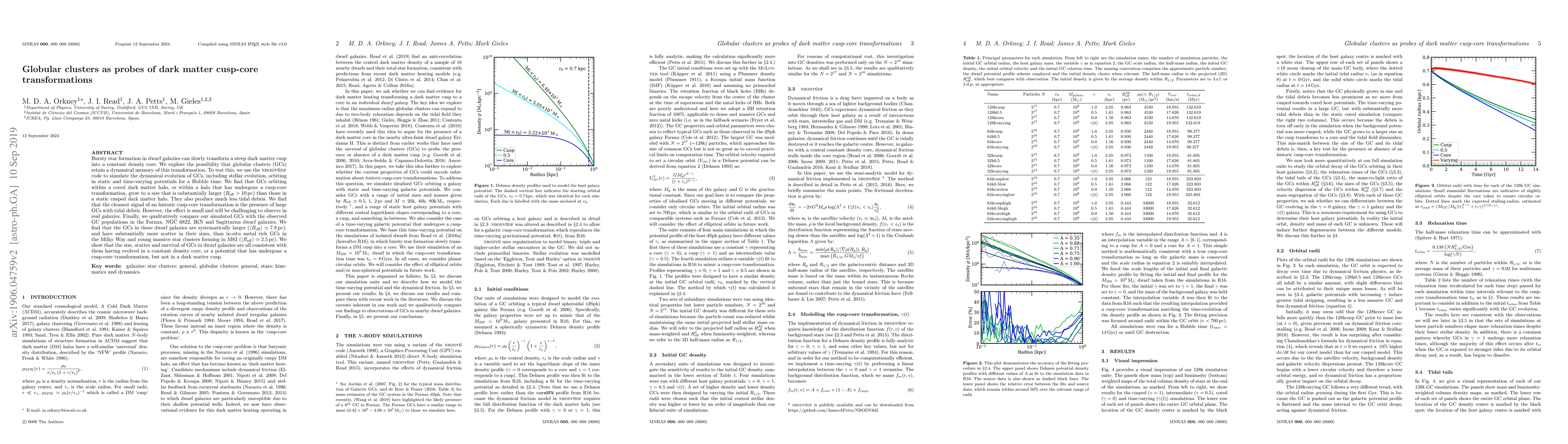 Bursty star formation in dwarf galaxies can slowly transform a steep dark matter cusp into a constant density core. We explore the possibility that globular clusters (GCs) retain a dynamical memory of this transformation. To test this, we use the nbody6df code to simulate the dynamical evolution of GCs, including stellar evolution, orbiting in static and time-varying potentials for a Hubble time. We find that GCs orbiting within a cored dark matter halo, or within a halo that has undergone a cusp-core transformation, grow to a size that is substantially larger ($R_{\rm eff} > 10$ pc) than those in a static cusped dark matter halo. They also produce much less tidal debris. We find that the cleanest signal of an historic cusp-core transformation is the presence of large GCs with tidal debris. However, the effect is small and will be challenging to observe in real galaxies. Finally, we qualitatively compare our simulated GCs with the observed GC populations in the Fornax, NGC 6822, IKN and Sagittarius dwarf galaxies. We find that the GCs in these dwarf galaxies are systematically larger ($\langle R_{\rm eff}\rangle \simeq 7.8$ pc), and have substantially more scatter in their sizes, than in-situ metal rich GCs in the Milky Way and young massive star clusters forming in M83 ($\langle R_{\rm eff} \rangle \simeq 2.5$ pc). We show that the size, scatter and survival of GCs in dwarf galaxies are all consistent with them having evolved in a constant density core, or a potential that has undergone a cusp-core transformation, but not in a dark matter cusp.