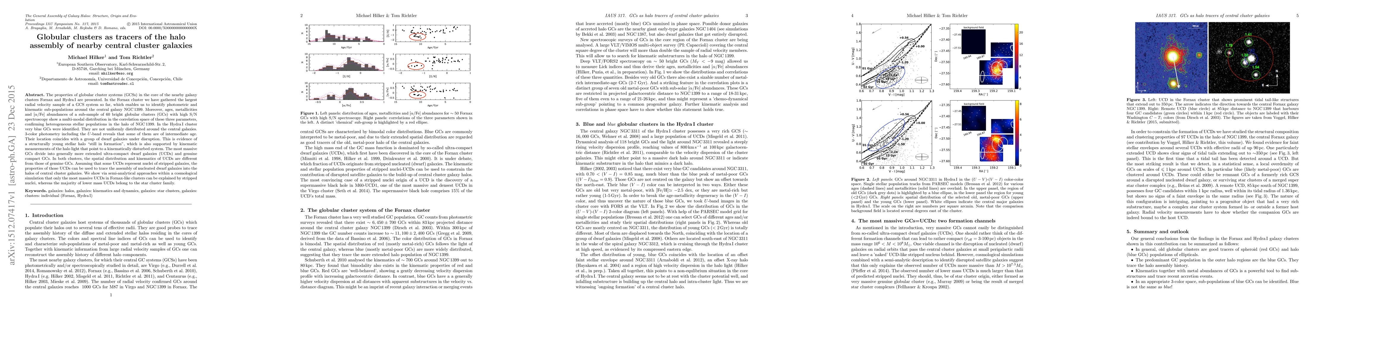 The properties of globular cluster systems (GCSs) in the core of the nearby galaxy clusters Fornax and Hydra I are presented. In the Fornax cluster we have gathered the largest radial velocity sample of a GCS system so far, which enables us to identify photometric and kinematic sub-populations around the central galaxy NGC 1399. Moreover, ages, metallicities and [alpha/Fe] abundances of a sub-sample of 60 bright globular clusters (GCs) with high S/N spectroscopy show a multi-modal distribution in the correlation space of these three parameters, confirming heterogeneous stellar populations in the halo of NGC 1399. In the Hydra I cluster very blue GCs were identified. They are not uniformly distributed around the central galaxies. 3-color photometry including the U-band reveals that some of them are of intermediate age. Their location coincides with a group of dwarf galaxies under disruption. This is evidence of a structurally young stellar halo 'still in formation', which is also supported by kinematic measurements of the halo light that point to a kinematically disturbed system. The most massive GCs divide into generally more extended ultra-compact dwarf galaxies (UCDs) and genuine compact GCs. In both clusters, the spatial distribution and kinematics of UCDs are different from those of genuine GCs. Assuming that some UCDs represent nuclei of stripped galaxies, the properties of those UCDs can be used to trace the assembly of nucleated dwarf galaxies into the halos of central cluster galaxies. We show via semi-analytical approaches within a cosmological simulation that only the most massive UCDs in Fornax-like clusters can be explained by stripped nuclei, whereas the majority of lower mass UCDs belong to the star cluster family.