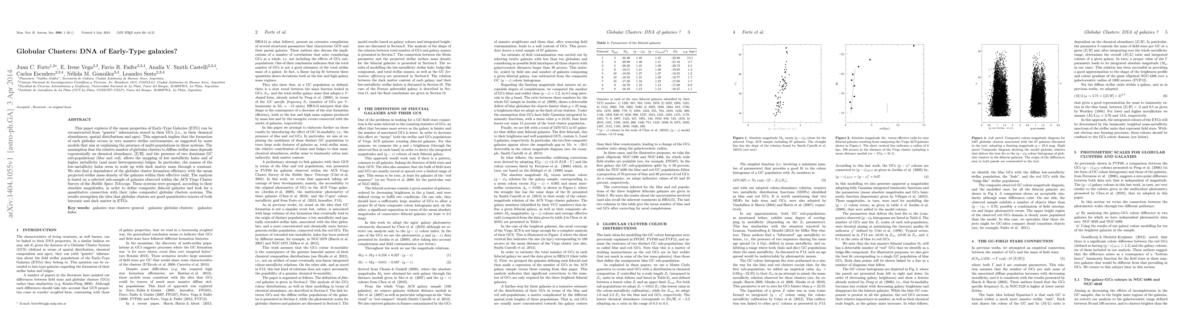 This paper explores if the mean properties of Early-Type Galaxies (ETG) can be reconstructed from "genetic" information stored in their GCs (i.e., in their chemical abundances, spatial distributions and ages). This approach implies that the formation of each globular occurs in very massive stellar environments, as suggested by some models that aim at explaining the presence of multi-populations in these systems. The assumption that the relative number of globular clusters to diffuse stellar mass depends exponentially on chemical abundance, [Z/H], and the presence of two dominant GC sub-populations blue and red, allows the mapping of low metallicity halos and of higher metallicity (and more heterogeneous) bulges. In particular, the masses of the low-metallicity halos seem to scale up with dark matter mass through a constant. We also find a dependence of the globular cluster formation efficiency with the mean projected stellar mass density of the galaxies within their effective radii. The analysis is based on a selected sub-sample of galaxies observed within the ACS Virgo Cluster Survey of the {\it Hubble Space Telescope}. These systems were grouped, according to their absolute magnitudes, in order to define composite fiducial galaxies and look for a quantitative connection with their (also composite) globular clusters systems. The results strengthen the idea that globular clusters are good quantitative tracers of both baryonic and dark matter in ETGs.