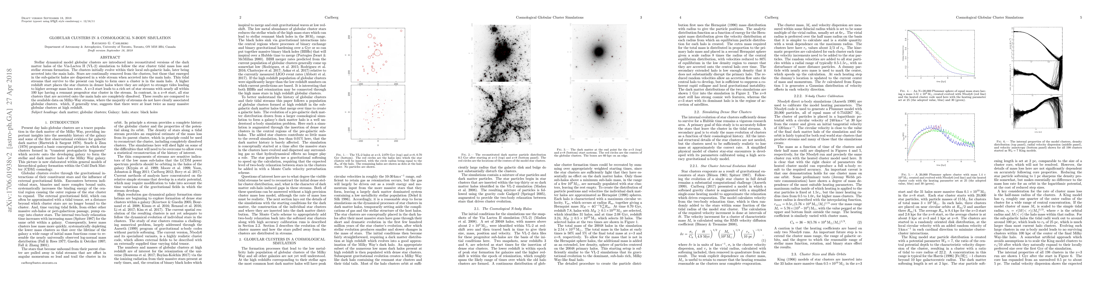 Stellar dynamical model globular clusters are introduced into reconstituted versions of the dark matter halos of the Via-Lactea II (VL-2) simulation to follow the star cluster tidal mass loss and stellar stream formation. The clusters initially evolve within their local sub-galactic halo, later being accreted into the main halo. Stars are continually removed from the clusters, but those that emerged in the sub-galactic halos are dispersed in a wide stream when accreted into the main halo. Thin tidal streams that survive to the present can begin to form once a cluster is in the main halo. A higher redshift start places the star clusters in denser halos where they are subject to stronger tides leading to higher average mass loss rates. A z=3 start leads to a rich set of star streams with nearly all within 100 kpc having a remnant progenitor star cluster in the stream. In contrast, in a z=8 start, all star clusters that are accreted onto the main halo are completely dissolved. These results are compared to the available data on Milky-Way streams, where the majority of streams do not have clearly associated globular clusters. which, if generally true, suggests that there were at least twice as many massive globular clusters at high redshift.