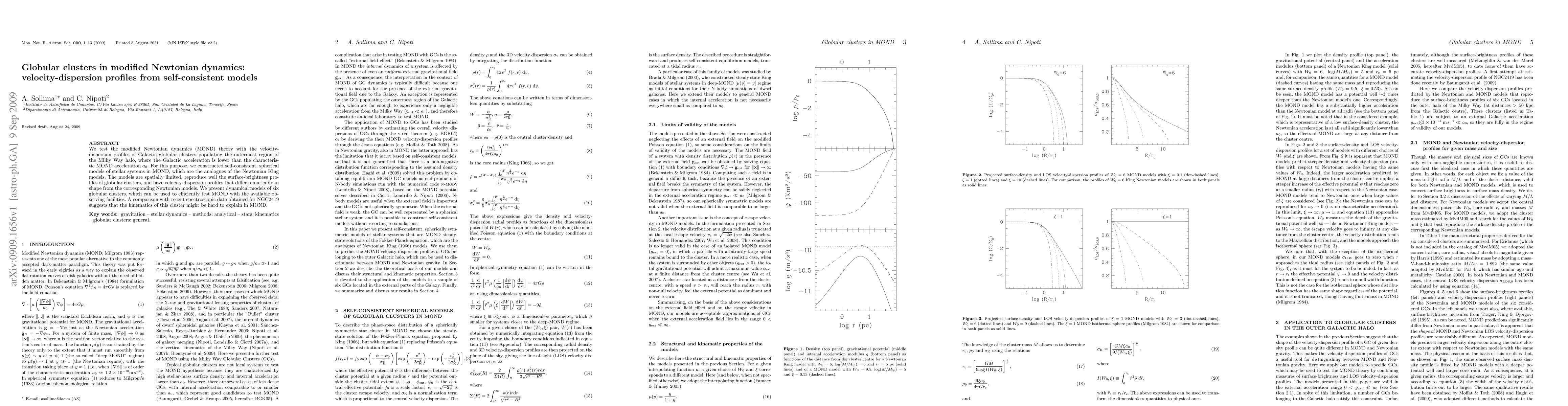 This paper tests the modified Newtonian dynamics (MOND) theory using velocity-dispersion profiles of Galactic globular clusters. Self-consistent models in MOND show different velocity-dispersion shapes compared to Newtonian models, but NGC2419's kinematics may be challenging to explain within MOND.