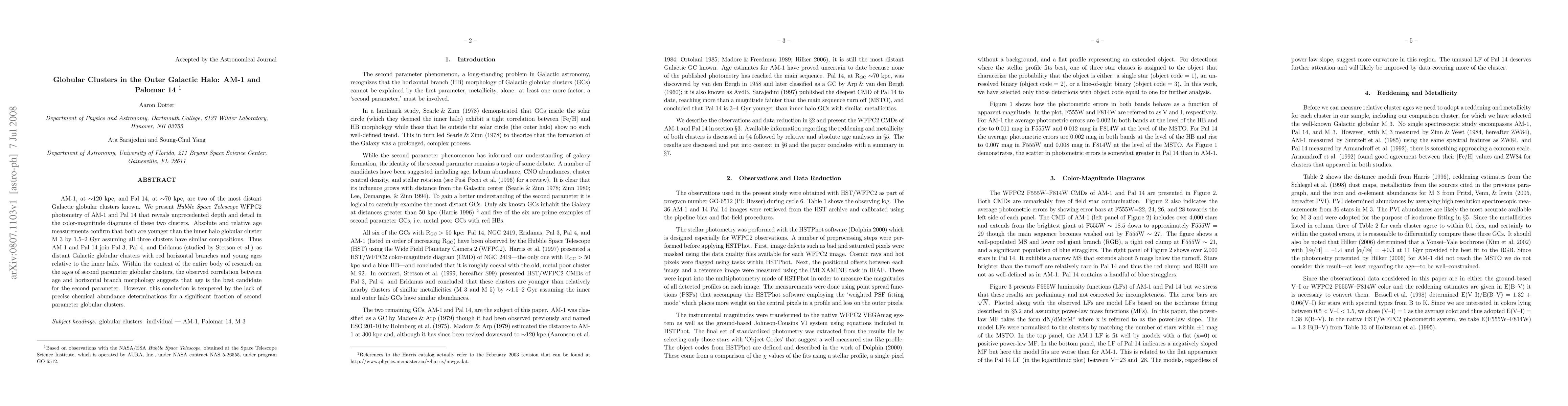 This paper uses Hubble Space Telescope data to study the distant globular clusters AM-1 and Pal 14, finding they are younger than M 3 by 1.5-2 Gyr and have red horizontal branches. The study suggests age may be the "second parameter" influencing horizontal branch morphology, though precise chemical abundance data is lacking for many clusters.