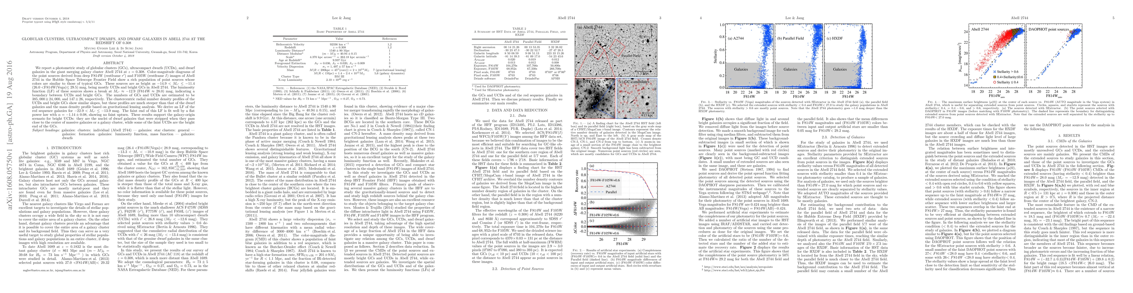 We report a photometric study of globular clusters (GCs), ultracompact dwarfs (UCDs), and dwarf galaxies in the giant merging galaxy cluster Abell 2744 at z = 0.308. Color-magnitude diagrams of the point sources derived from deep F814W (restframe r') and F105W (restframe I) images of Abell 2744 in the Hubble Space Telescope Frontier Field show a rich population of point sources whose colors are similar to those of typical GCs. These sources are as bright as -14.9 < M_r' < -11.4 (26.0 < F814W < 29.5) mag, being mostly UCDs and bright GCs in Abell 2744. The luminosity function (LF) of these sources shows a break at M_r' ~ -12.9 (F814W ~ 28.0) mag, indicating a boundary between UCDs and bright GCs. The numbers of GCs and UCDs are estimated to be N_GC = 385,000+-24,000, and 147 +- 26, respectively. The clustercentric radial number density profiles of the UCDs and bright GCs show similar slopes, but these profiles are much steeper than that of the dwarf galaxies and the mass density profile based on gravitational lensing analysis. We derive an LF of the red sequence galaxies for -22.9 < M_r' < -13.9 mag. The faint end of this LF is fit well by a flat power law with a = -1.14 +- 0.08, showing no faint upturn. These results support the galaxy-origin scenario for bright UCDs: they are the nuclei of dwarf galaxies that were stripped when they pass close to the center of massive galaxies or a galaxy cluster, while some of the faint UCDs are the bright end of the GCs.