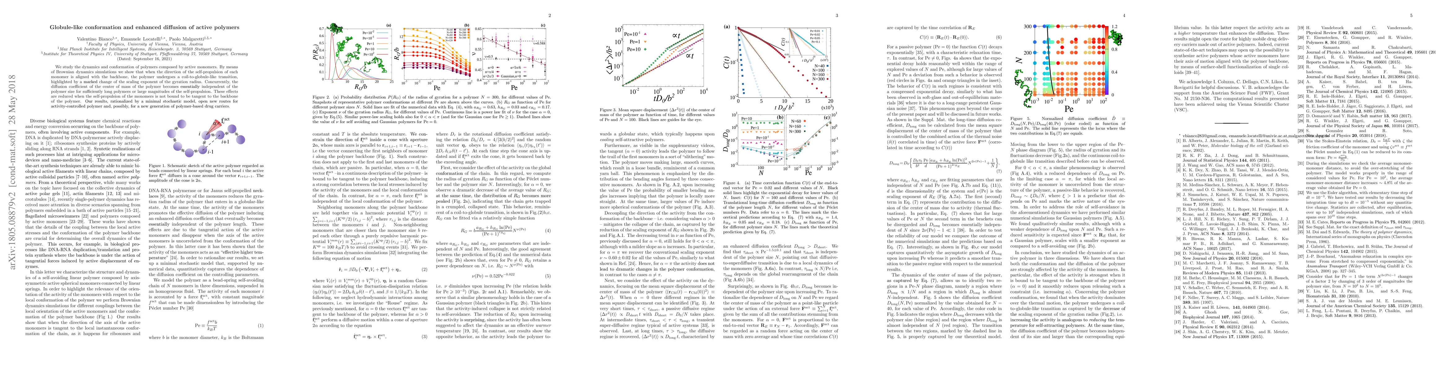 This paper investigates the dynamics and conformation of active polymers through Brownian dynamics simulations, revealing that aligned self-propulsion of monomers induces a coil-to-globule transition and enhances diffusion independence of the polymer's center of mass. These effects diminish when monomer propulsion is not aligned with the polymer's backbone.