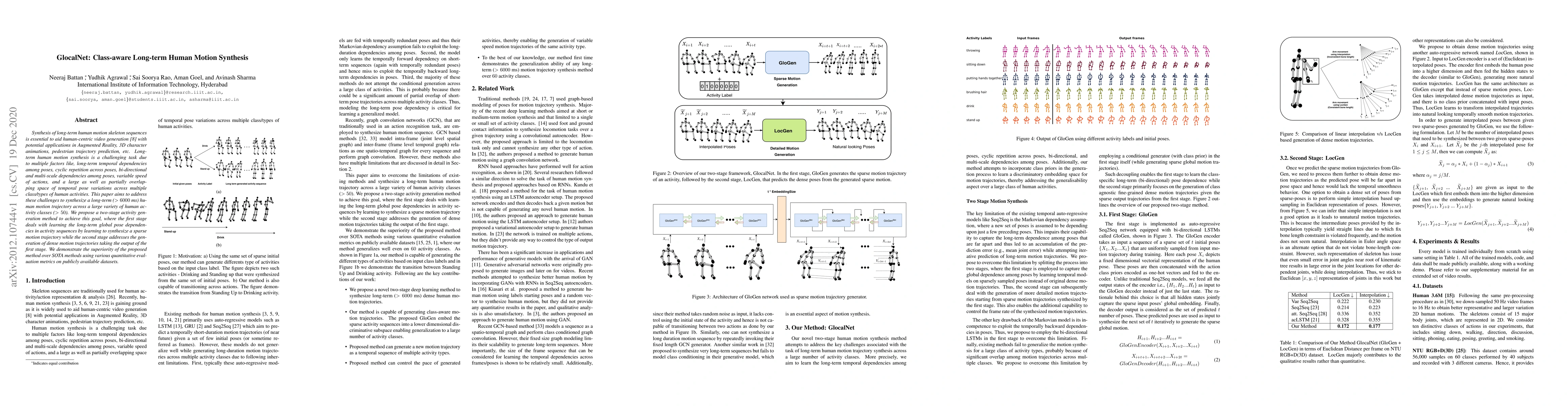 This paper proposes a two-stage method for synthesizing long-term human motion trajectories across diverse activity classes, addressing challenges like temporal dependencies and variable speeds. The method outperforms existing techniques in generating realistic and varied motion sequences.