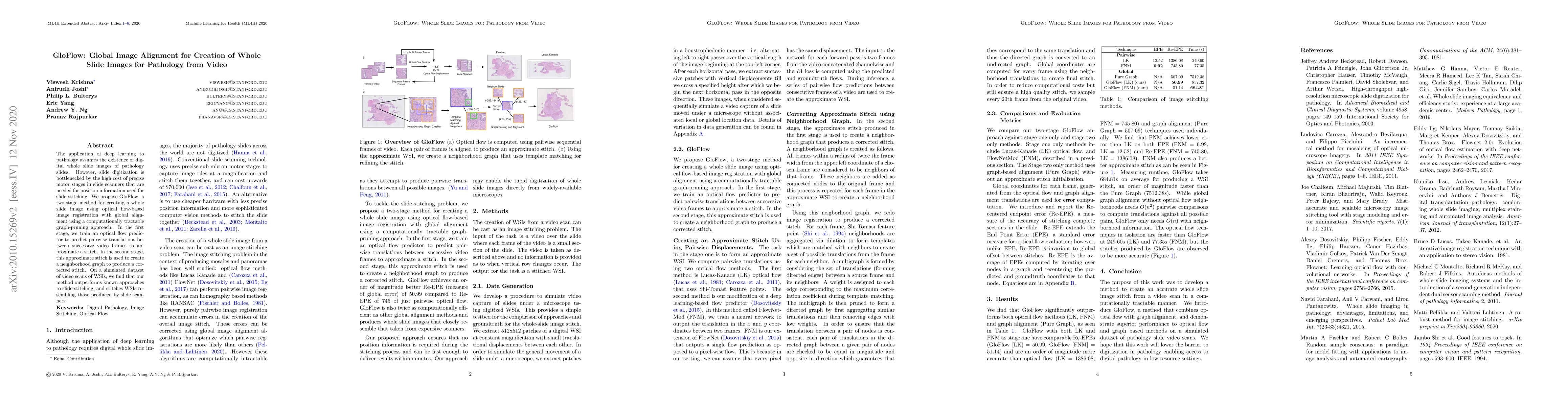 GloFlow is a two-stage method for creating whole slide images from pathology video using optical flow and graph-pruning. It outperforms existing slide-stitching techniques, generating high-quality images comparable to those produced by slide scanners.