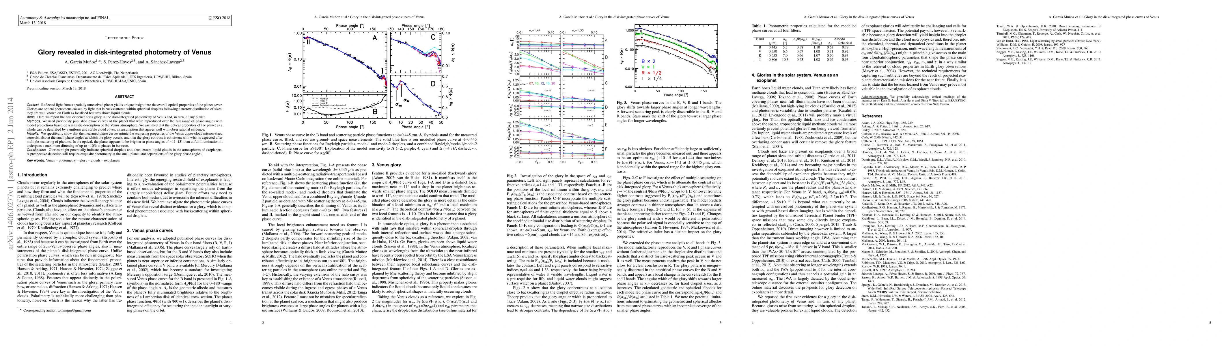 This study presents the first evidence of a glory, an optical phenomenon caused by backscattered light in spherical droplets, in Venus' disk-integrated photometry. Using reproduced phase curves and model predictions, researchers found Venus appears brighter at phase angles of 11-13 degrees than at full illumination, dimming up to 10 percent. The findings suggest potential liquid clouds in Venus' atmosphere and implications for detecting similar phenomena on exoplanets, requiring precise photometry at small planet-star separations.