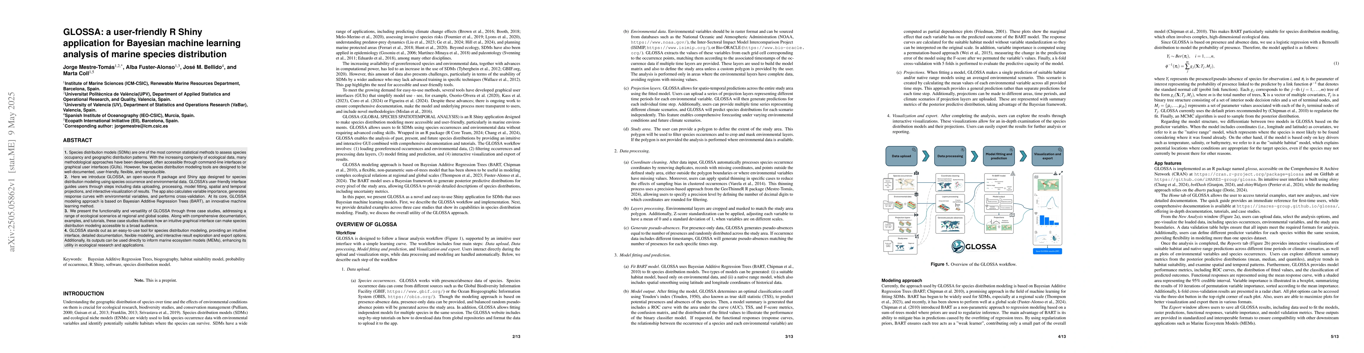GLOSSA is an open-source R package and Shiny app for species distribution modeling using Bayesian Additive Regression Trees (BART). It offers a user-friendly interface for data uploading, processing, model fitting, and interactive visualization of results, making species distribution modeling accessible to a broad audience.
