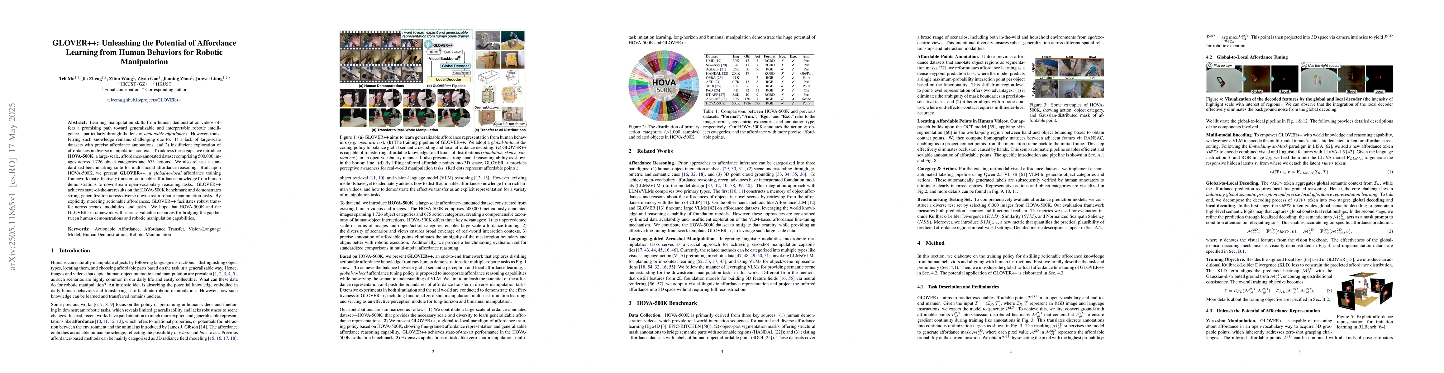 The research introduces HOVA-500K, a large-scale, affordance-annotated dataset of 500,000 images across 1,726 object categories and 675 actions, along with a benchmarking suite for multi-modal affordance reasoning. It also presents GLOVER++, a global-to-local affordance training framework that transfers knowledge from human demonstrations to robotic manipulation tasks.