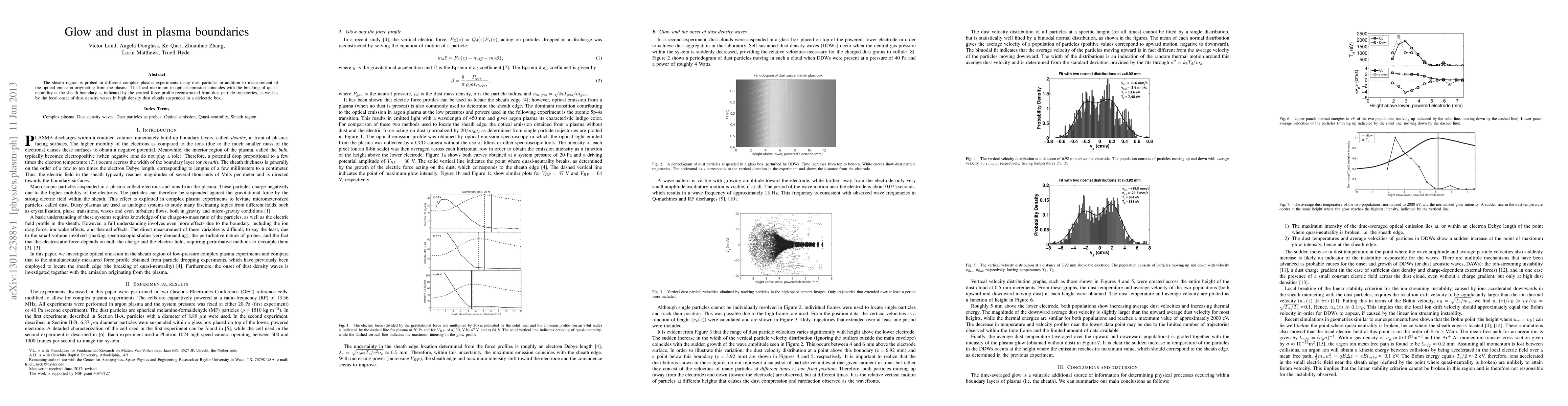 This research uses dust particles to probe sheath regions in complex plasmas, finding that local optical emission maxima align with sheath boundary quasi-neutrality breakdown, as indicated by dust particle trajectories and density wave onset in high-density dust clouds.