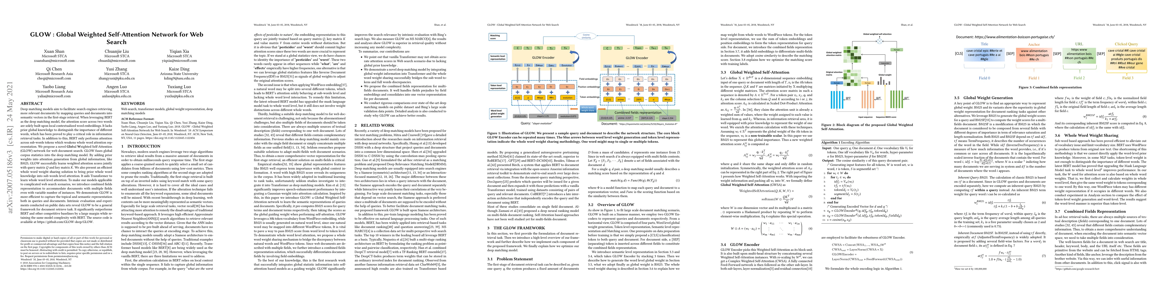 Deep matching models aim to facilitate search engines retrieving more relevant documents by mapping queries and documents into semantic vectors in the first-stage retrieval. When leveraging BERT as the deep matching model, the attention score across two words are solely built upon local contextualized word embeddings. It lacks prior global knowledge to distinguish the importance of different words, which has been proved to play a critical role in information retrieval tasks. In addition to this, BERT only performs attention across sub-words tokens which weakens whole word attention representation. We propose a novel Global Weighted Self-Attention (GLOW) network for web document search. GLOW fuses global corpus statistics into the deep matching model. By adding prior weights into attention generation from global information, like BM25, GLOW successfully learns weighted attention scores jointly with query matrix $Q$ and key matrix $K$. We also present an efficient whole word weight sharing solution to bring prior whole word knowledge into sub-words level attention. It aids Transformer to learn whole word level attention. To make our models applicable to complicated web search scenarios, we introduce combined fields representation to accommodate documents with multiple fields even with variable number of instances. We demonstrate GLOW is more efficient to capture the topical and semantic representation both in queries and documents. Intrinsic evaluation and experiments conducted on public data sets reveal GLOW to be a general framework for document retrieve task. It significantly outperforms BERT and other competitive baselines by a large margin while retaining the same model complexity with BERT.