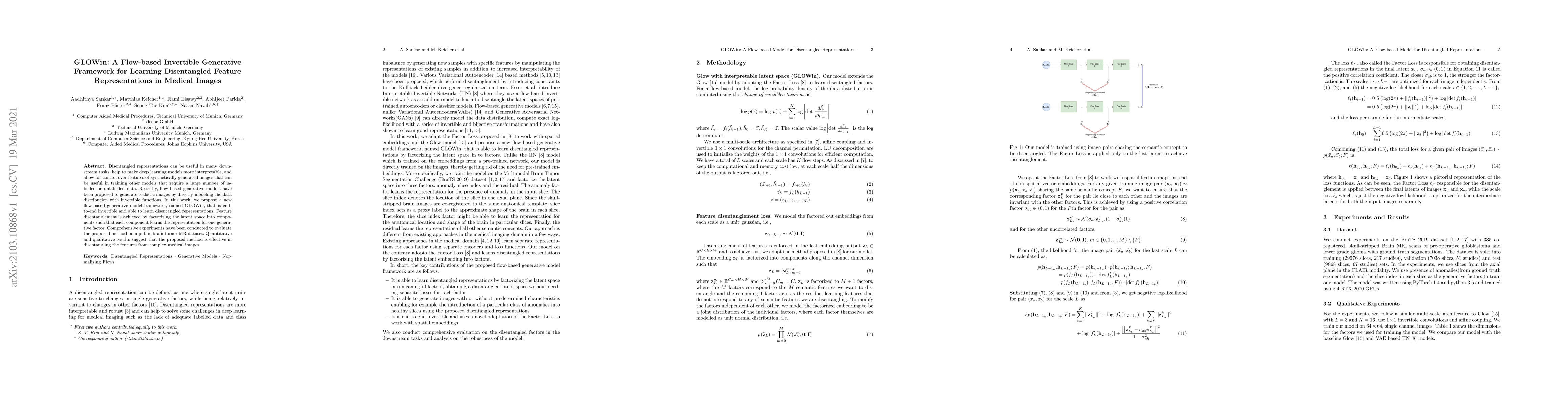 Title: GLOWin: A Flow-based Invertible Generative Framework for Learning Disentangled Feature Representations in Medical Images Summary: GLOWin is an invertible generative model that learns disentangled feature representations from medical images, facilitating interpretability and control over synthetic data generation. Experiments on a brain tumor MR dataset demonstrate its effectiveness in feature disentanglement.