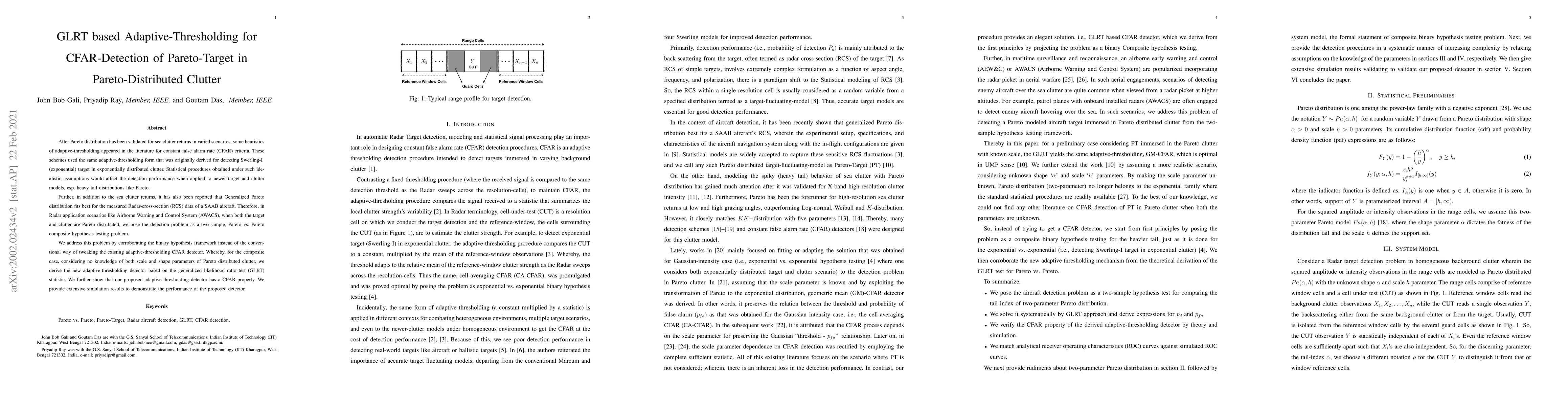 This paper proposes a new adaptive-thresholding CFAR detector based on the generalized likelihood ratio test (GLRT) for detecting Pareto-distributed targets in Pareto-distributed clutter, addressing the limitations of existing heuristics. The proposed method demonstrates improved detection performance in radar applications like AWACS.