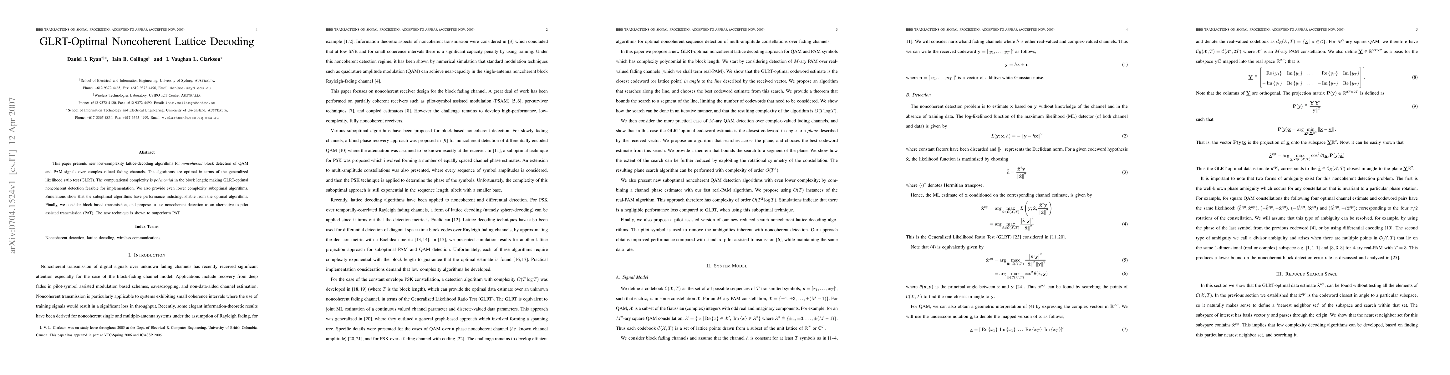 New low-complexity lattice-decoding algorithms for noncoherent block detection of QAM and PAM signals over fading channels have been developed, achieving GLRT-optimal performance with polynomial complexity.