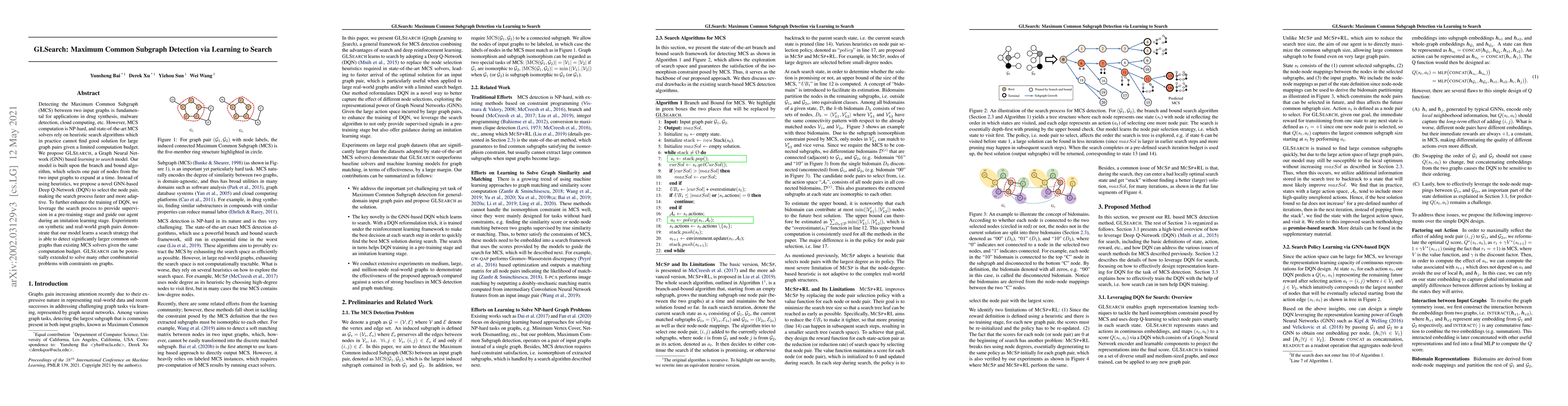 GLSearch proposes a GNN-based learning to search model to detect Maximum Common Subgraphs (MCS) efficiently. It employs a Deep Q-Network (DQN) to adaptively select node pairs for expansion, improving search speed and effectiveness over heuristic methods.