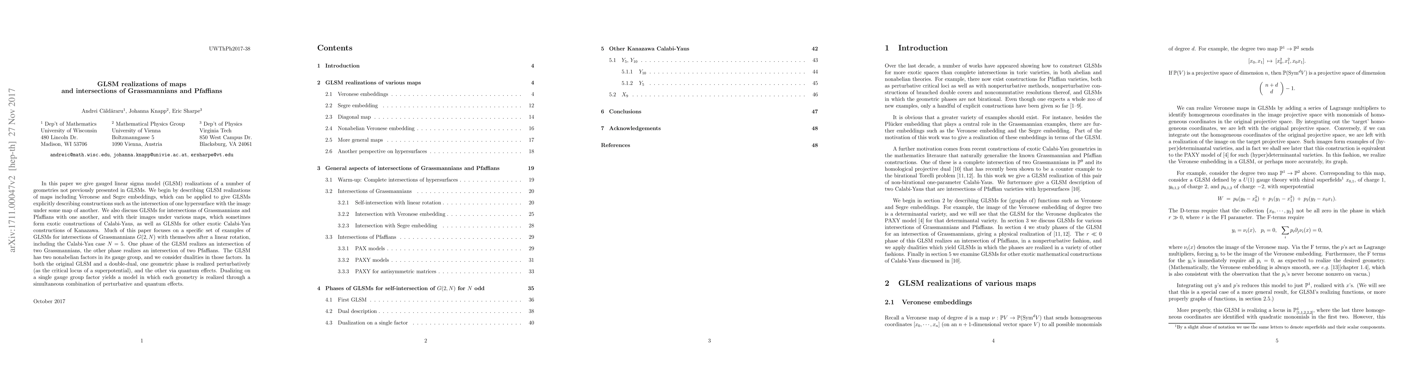 In this paper we give gauged linear sigma model (GLSM) realizations of a number of geometries not previously presented in GLSMs. We begin by describing GLSM realizations of maps including Veronese and Segre embeddings, which can be applied to give GLSMs explicitly describing constructions such as the intersection of one hypersurface with the image under some map of another. We also discuss GLSMs for intersections of Grassmannians and Pfaffians with one another, and with their images under various maps, which sometimes form exotic constructions of Calabi-Yaus, as well as GLSMs for other exotic Calabi-Yau constructions of Kanazawa. Much of this paper focuses on a specific set of examples of GLSMs for intersections of Grassmannians G(2,N) with themselves after a linear rotation, including the Calabi-Yau case N=5. One phase of the GLSM realizes an intersection of two Grassmannians, the other phase realizes an intersection of two Pfaffians. The GLSM has two nonabelian factors in its gauge group, and we consider dualities in those factors. In both the original GLSM and a double-dual, one geometric phase is realized perturbatively (as the critical locus of a superpotential), and the other via quantum effects. Dualizing on a single gauge group factor yields a model in which each geometry is realized through a simultaneous combination of perturbative and quantum effects.