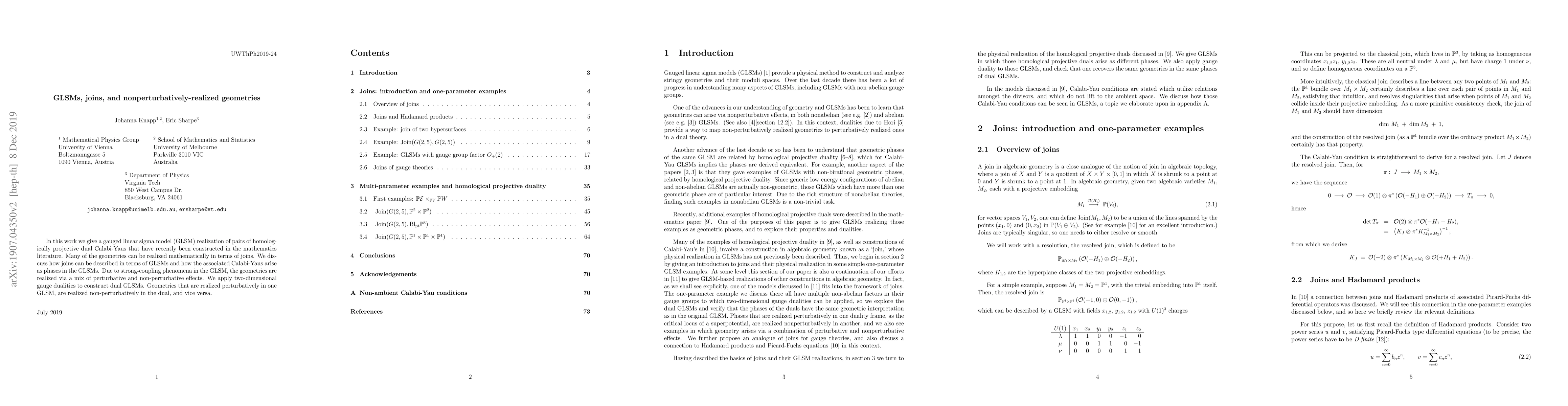 This research presents a method to realize pairs of specific mathematical spaces (homologically projective dual Calabi-Yaus) using gauged linear sigma models (GLSMs). It explains how complex geometric structures, some described by joins, can be understood through GLSMs, with these Calabi-Yau spaces emerging as different phases. The study highlights that these geometries are formed via both perturbative and non-perturbative effects in the GLSMs, utilizing two-dimensional gauge dualities to construct dual models. Essentially, geometries appearing perturbatively in one GLSM manifest non-perturbatively in its dual, and vice versa.