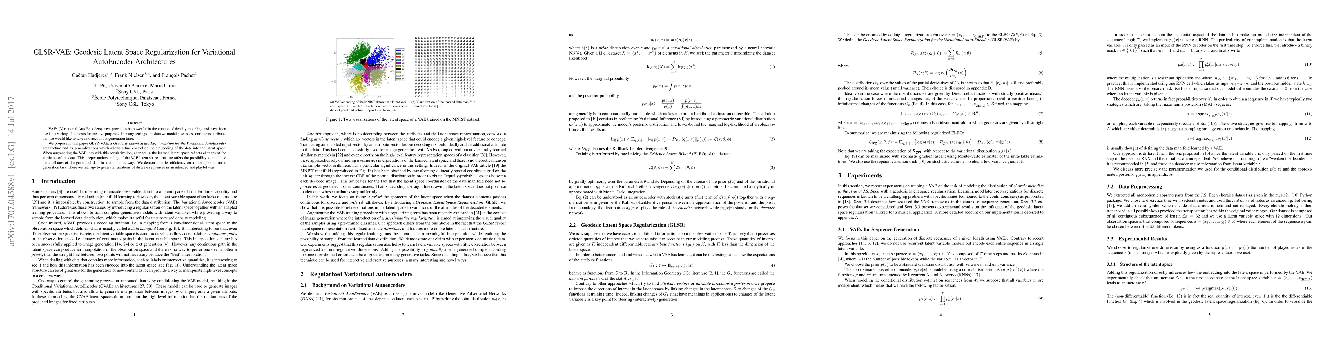 VAEs (Variational AutoEncoders) have proved to be powerful in the context of density modeling and have been used in a variety of contexts for creative purposes. In many settings, the data we model possesses continuous attributes that we would like to take into account at generation time. We propose in this paper GLSR-VAE, a Geodesic Latent Space Regularization for the Variational AutoEncoder architecture and its generalizations which allows a fine control on the embedding of the data into the latent space. When augmenting the VAE loss with this regularization, changes in the learned latent space reflects changes of the attributes of the data. This deeper understanding of the VAE latent space structure offers the possibility to modulate the attributes of the generated data in a continuous way. We demonstrate its efficiency on a monophonic music generation task where we manage to generate variations of discrete sequences in an intended and playful way.