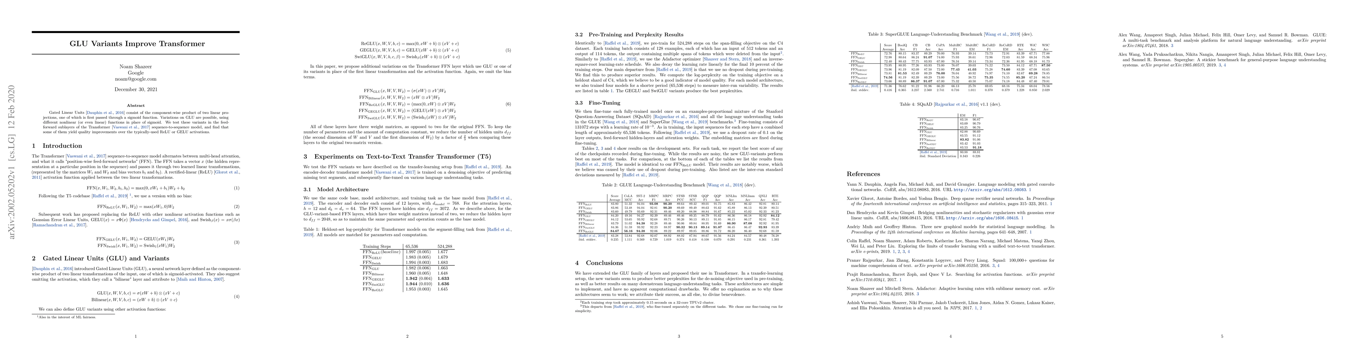 Gated Linear Units (arXiv:1612.08083) consist of the component-wise product of two linear projections, one of which is first passed through a sigmoid function. Variations on GLU are possible, using different nonlinear (or even linear) functions in place of sigmoid. We test these variants in the feed-forward sublayers of the Transformer (arXiv:1706.03762) sequence-to-sequence model, and find that some of them yield quality improvements over the typically-used ReLU or GELU activations.