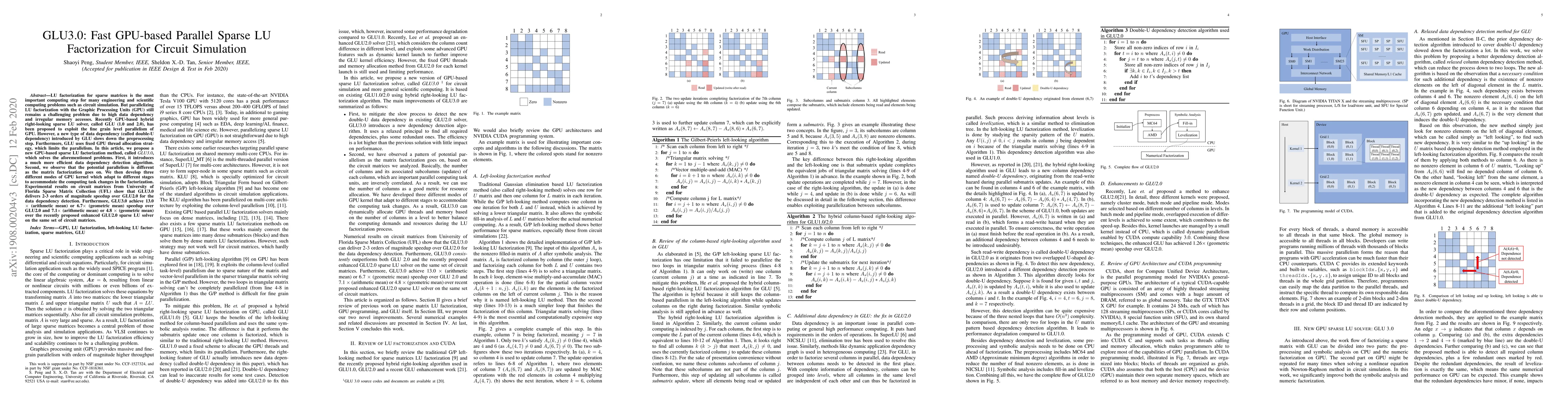 GLU3.0 introduces an efficient data dependency detection algorithm and adaptive GPU kernel modes to address the challenges of parallelizing sparse LU factorization on GPUs, achieving significant speedups over previous versions and other solvers. Experimental results show up to 3 orders of magnitude improvement in data dependency detection and substantial overall performance gains.
