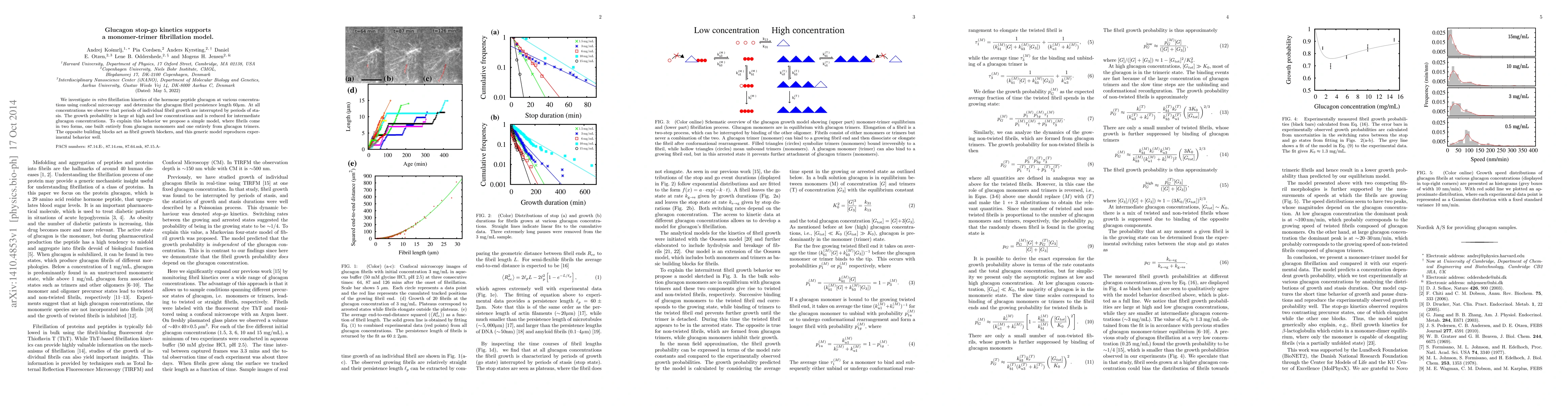 Glucagon fibrils exhibit stop-go kinetics, with periods of growth interrupted by stasis, and a proposed model suggests that monomers and trimers act as growth blockers.