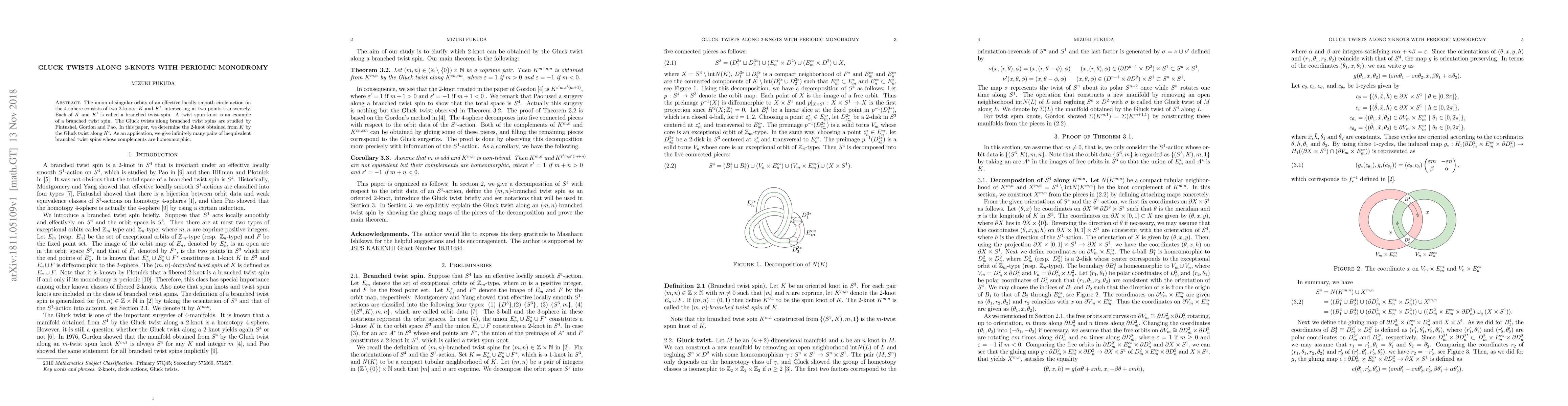 The union of singular orbits of an effective locally smooth circle action on the 4-sphere consists of two 2-knots, $K$ and $K^{\prime}$, intersecting at two points transversely. Each of $K$ and $K^{\prime}$ is called a branched twist spin. A twist spun knot is an example of a branched twist spin. The Gluck twists along branched twist spins are studied by Fintushel, Gordon and Pao. In this paper, we determine the 2-knot obtained from $K$ by the Gluck twist along $K^{\prime}$. As an application, we give infinitely many pairs of inequivalent branched twist spins whose complements are homeomorphic.