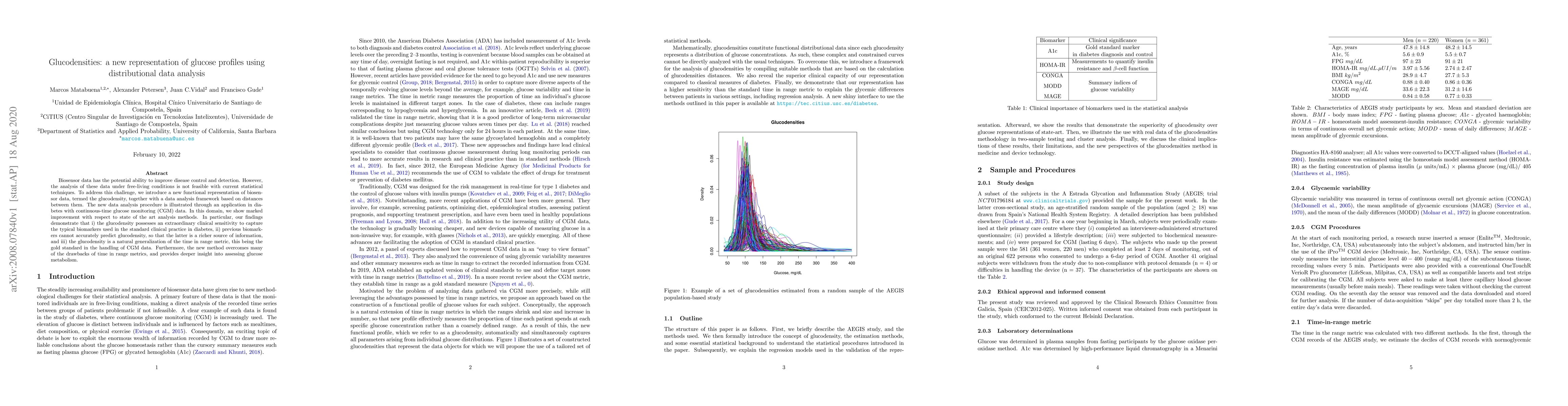 Biosensor data has the potential ability to improve disease control and detection. However, the analysis of these data under free-living conditions is not feasible with current statistical techniques. To address this challenge, we introduce a new functional representation of biosensor data, termed the glucodensity, together with a data analysis framework based on distances between them. The new data analysis procedure is illustrated through an application in diabetes with continuous-time glucose monitoring (CGM) data. In this domain, we show marked improvement with respect to state of the art analysis methods. In particular, our findings demonstrate that i) the glucodensity possesses an extraordinary clinical sensitivity to capture the typical biomarkers used in the standard clinical practice in diabetes, ii) previous biomarkers cannot accurately predict glucodensity, so that the latter is a richer source of information, and iii) the glucodensity is a natural generalization of the time in range metric, this being the gold standard in the handling of CGM data. Furthermore, the new method overcomes many of the drawbacks of time in range metrics, and provides deeper insight into assessing glucose metabolism.