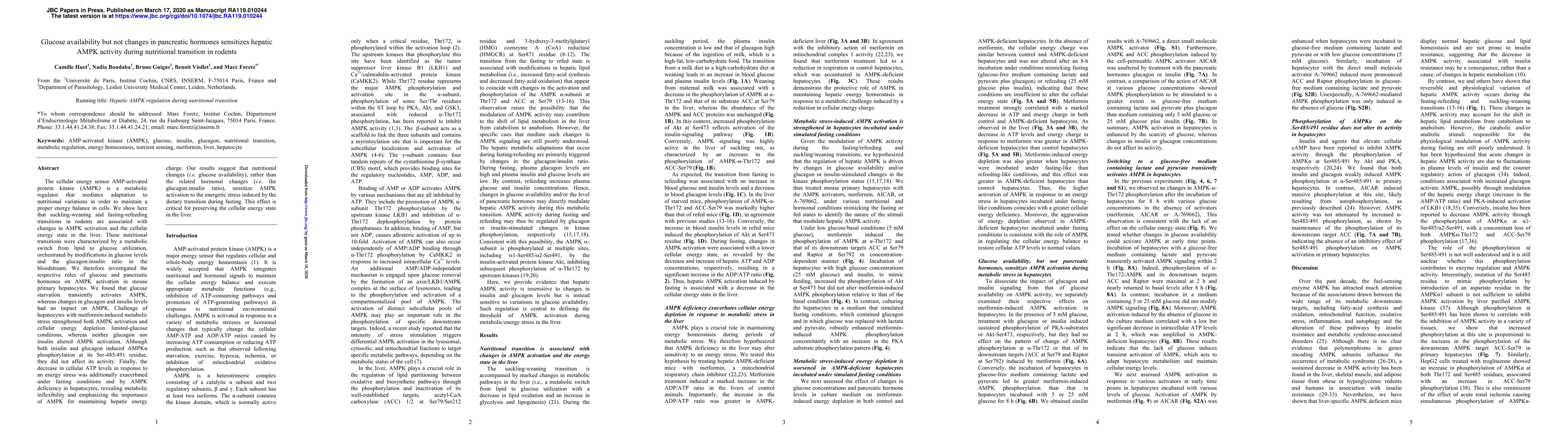 Glucose availability, but not changes in pancreatic hormones, activates AMPK activity in mouse liver cells during nutritional transitions. This highlights the importance of glucose levels over hormonal regulation in maintaining hepatic energy balance.