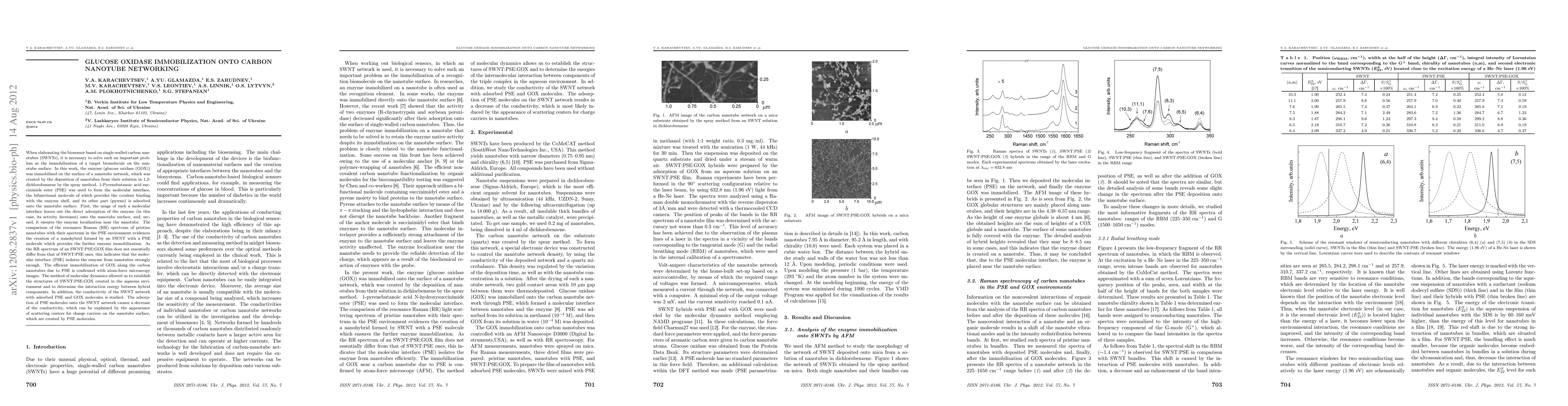 When elaborating the biosensor based on single-walled carbon nanotubes (SWNTs), it is necessary to solve such an important problem as the immobilization of a target biomolecule on the nanotube surface. In this work, the enzyme (glucose oxidase (GOX)) was immobilized on the surface of a nanotube network, which was created by the deposition of nanotubes from their solution in 1,2-dichlorobenzene by the spray method. 1-Pyrenebutanoic acid succinimide ester (PSE) was used to form the molecular interface, the bifunctional molecule of which provides the covalent binding with the enzyme shell, and its other part (pyrene) is adsorbed onto the nanotube surface. First, the usage of such a molecular interface leaves out the direct adsorption of the enzyme (in this case, its activity decreases) onto the nanotube surface, and, second, it ensures the enzyme localization near the nanotube. The comparison of the resonance Raman (RR) spectrum of pristine nanotubes with their spectrum in the PSE environment evidences the creation of a nanohybrid formed by an SWNT with a PSE molecule which provides the further enzyme immobilization. As the RR spectrum of an SWNT:PSE:GOX film does not essentially differ from that of SWNT:PSE ones, this indicates that the molecular interface (PSE) isolates the enzyme from nanotubes strongly enough. The efficient immobilization of GOX along the carbon nanotubes due to PSE is confirmed with atom-force microscopy images. The method of molecular dynamics allowed us to establish the structures of SWNT:PSE:GOX created in the aqueous environment and to determine the interaction energy between hybrid components. In addition, the conductivity of the SWNT network with adsorbed PSE and GOX molecules is studied.