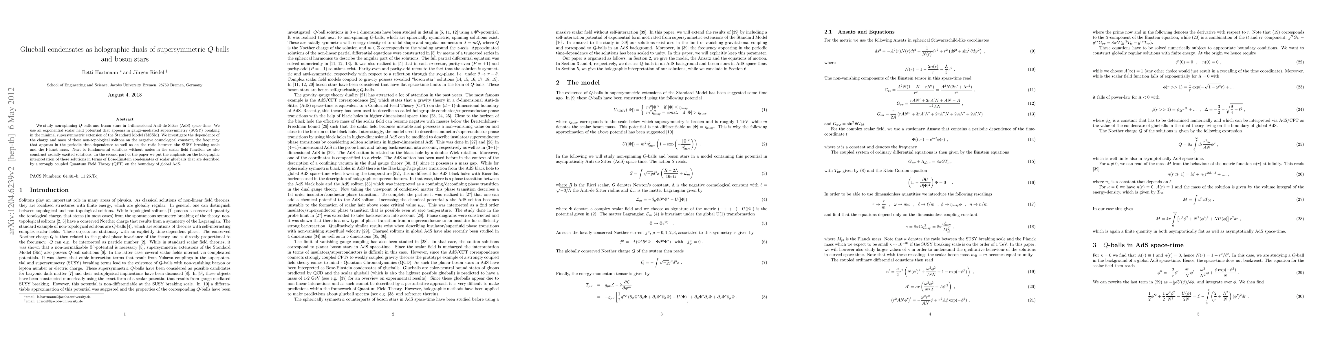 This research explores non-spinning Q-balls and boson stars in 4D AdS space using a supersymmetry-breaking potential. It examines the impact of the cosmological constant, frequency, and SUSY breaking scale on Q-ball and boson star properties. The study also constructs radially excited solutions and interprets these holographically as Bose-Einstein condensates of scalar glueballs, described by a strongly coupled QFT on the AdS boundary.