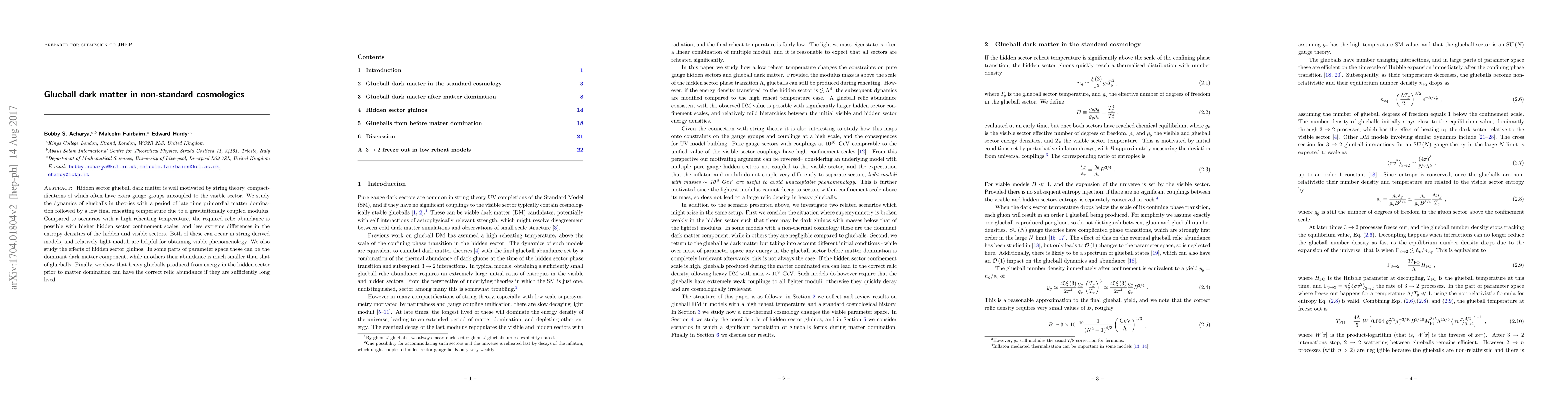 Hidden sector glueball dark matter is well motivated by string theory, compactifications of which often have extra gauge groups uncoupled to the visible sector. We study the dynamics of glueballs in theories with a period of late time primordial matter domination followed by a low final reheating temperature due to a gravitationally coupled modulus. Compared to scenarios with a high reheating temperature, the required relic abundance is possible with higher hidden sector confinement scales, and less extreme differences in the entropy densities of the hidden and visible sectors. Both of these can occur in string derived models, and relatively light moduli are helpful for obtaining viable phenomenology. We also study the effects of hidden sector gluinos. In some parts of parameter space these can be the dominant dark matter component, while in others their abundance is much smaller than that of glueballs. Finally, we show that heavy glueballs produced from energy in the hidden sector prior to matter domination can have the correct relic abundance if they are sufficiently long lived.