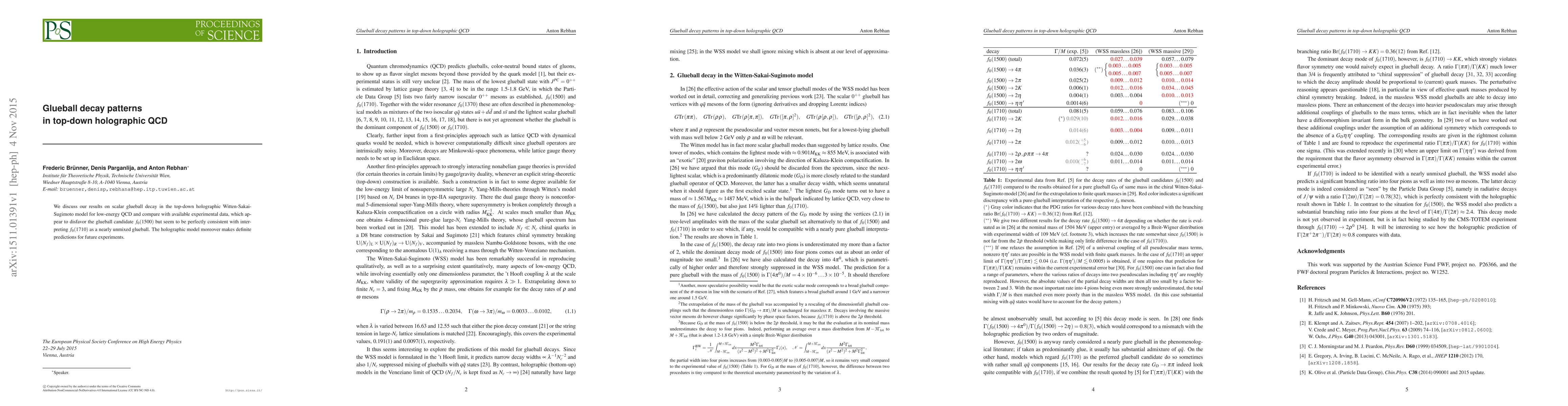 We discuss our results on scalar glueball decay in the top-down holographic Witten-Sakai-Sugimoto model for low-energy QCD and compare with available experimental data, which appear to disfavor the glueball candidate $f_0(1500)$ but seem to be perfectly consistent with interpreting $f_0(1710)$ as a nearly unmixed glueball. The holographic model moreover makes definite predictions for future experiments.