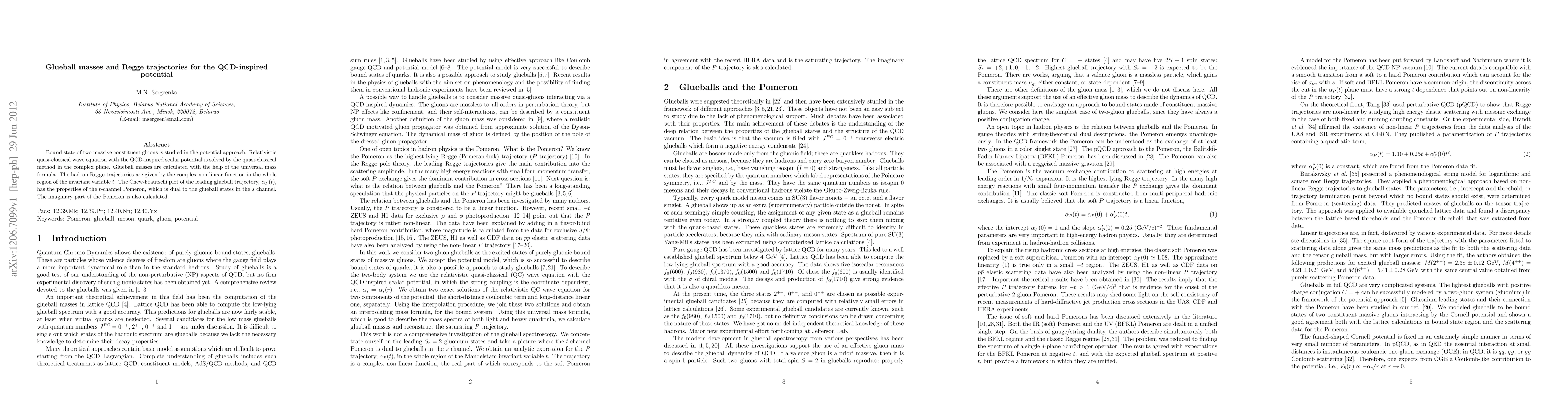 This paper studies the bound state of two massive constituent gluons using a QCD-inspired scalar potential and solves it via a quasi-classical method. The resulting glueball masses and Regge trajectories are analyzed, showing properties similar to the t-channel Pomeron, with calculations including the imaginary part of the Pomeron.
