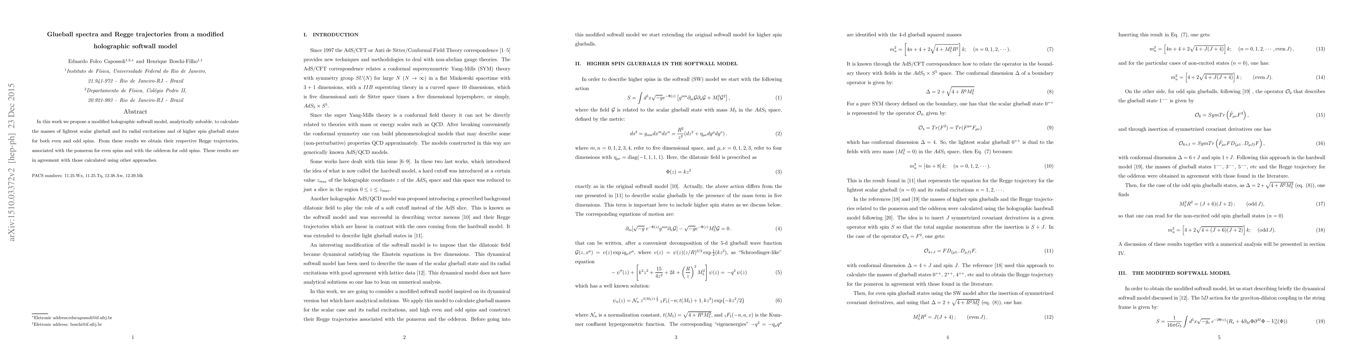 This paper proposes a modified holographic softwall model to analytically determine the masses of scalar glueballs and higher spin glueball states, deriving their respective Regge trajectories, which align with results from other methods.