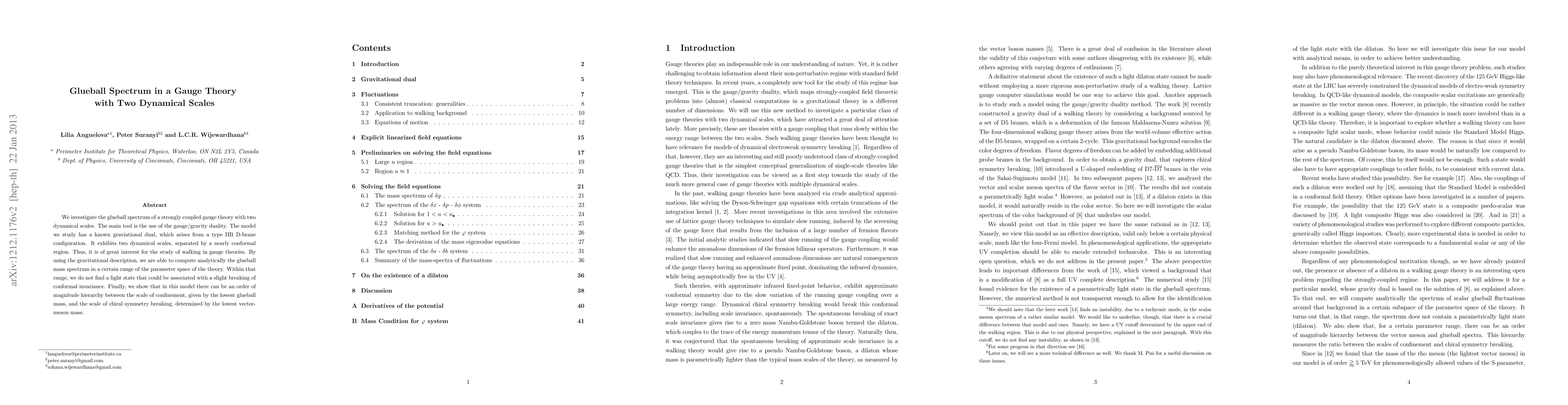 We investigate the glueball spectrum of a strongly coupled gauge theory with two dynamical scales. The main tool is the use of the gauge/gravity duality. The model we study has a known graviational dual, which arises from a type IIB D-brane configuration. It exhibits two dynamical scales, separated by a nearly conformal region. Thus, it is of great interest for the study of walking in gauge theories. By using the gravitational description, we are able to compute analytically the glueball mass spectrum in a certain range of the parameter space of the theory. Within that range, we do not find a light state that could be associated with a slight breaking of conformal invariance. Finally, we show that in this model there can be an order of magnitude hierarchy between the scale of confinement, given by the lowest glueball mass, and the scale of chiral symmetry breaking, determined by the lowest vector-meson mass.