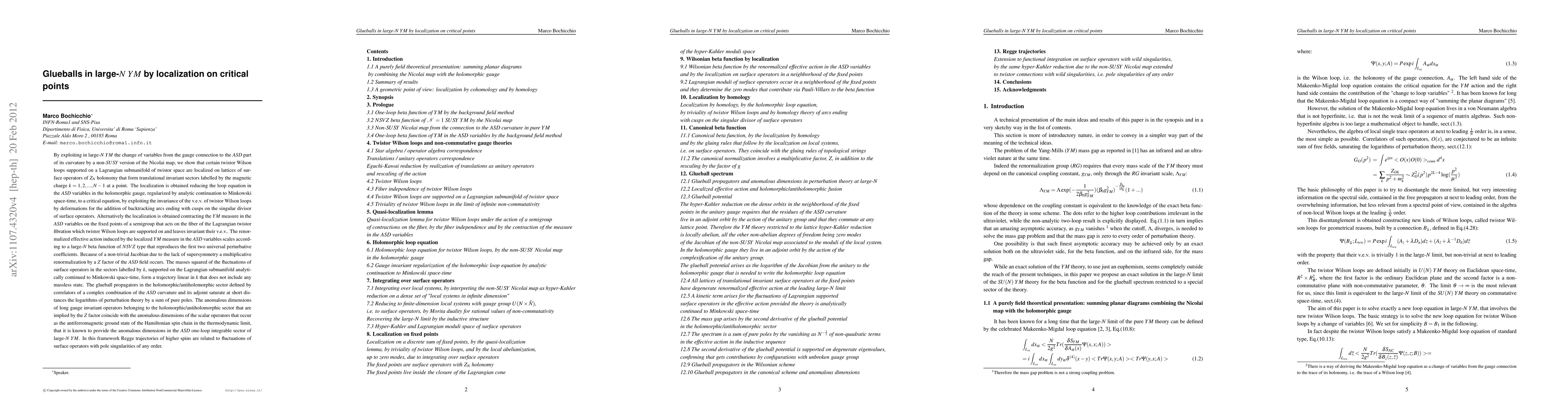 By exploiting in large-N YM the change of variables from the gauge connection to the ASD part of its curvature by a non-SUSY version of the Nicolai map, we show that certain twistor Wilson loops supported on a Lagrangian submanifold of twistor space are localized on lattices of surface operators of Z(N) holonomy that form translational invariant sectors labelled by the magnetic charge k=1,2,...,N-1 at a point. The localization is obtained reducing the loop equation in the ASD variables in the holomorphic gauge, regularized by analytic continuation to Minkowski space-time, to a critical equation, by exploiting the invariance of the twistor Wilson loops by deformations for the addition of backtracking arcs ending with cusps on the singular divisor of surface operators. Alternatively localization is obtained contracting the YM measure in the ASD variables on the fixed points of a semigroup that acts on the fiber of the Lagrangian twistor fibration which twistor Wilson loops are supported on and leaves invariant their v.e.v.. The masses squared of the fluctuations of surface operators in the sectors labelled by k, supported on the Lagrangian submanifold analytically continued to Minkowski space-time, form a trajectory linear in k that does not include any massless state. The glueballs propagators in the holomorphic/antiholomorphic sector defined by correlators of a complex combination of the ASD curvature and its adjoint saturate at short distances the logarithms of perturbation theory by a sum of pure poles. In this framework Regge trajectories of higher spins are related to fluctuations of surface operators with pole singularities of any order.